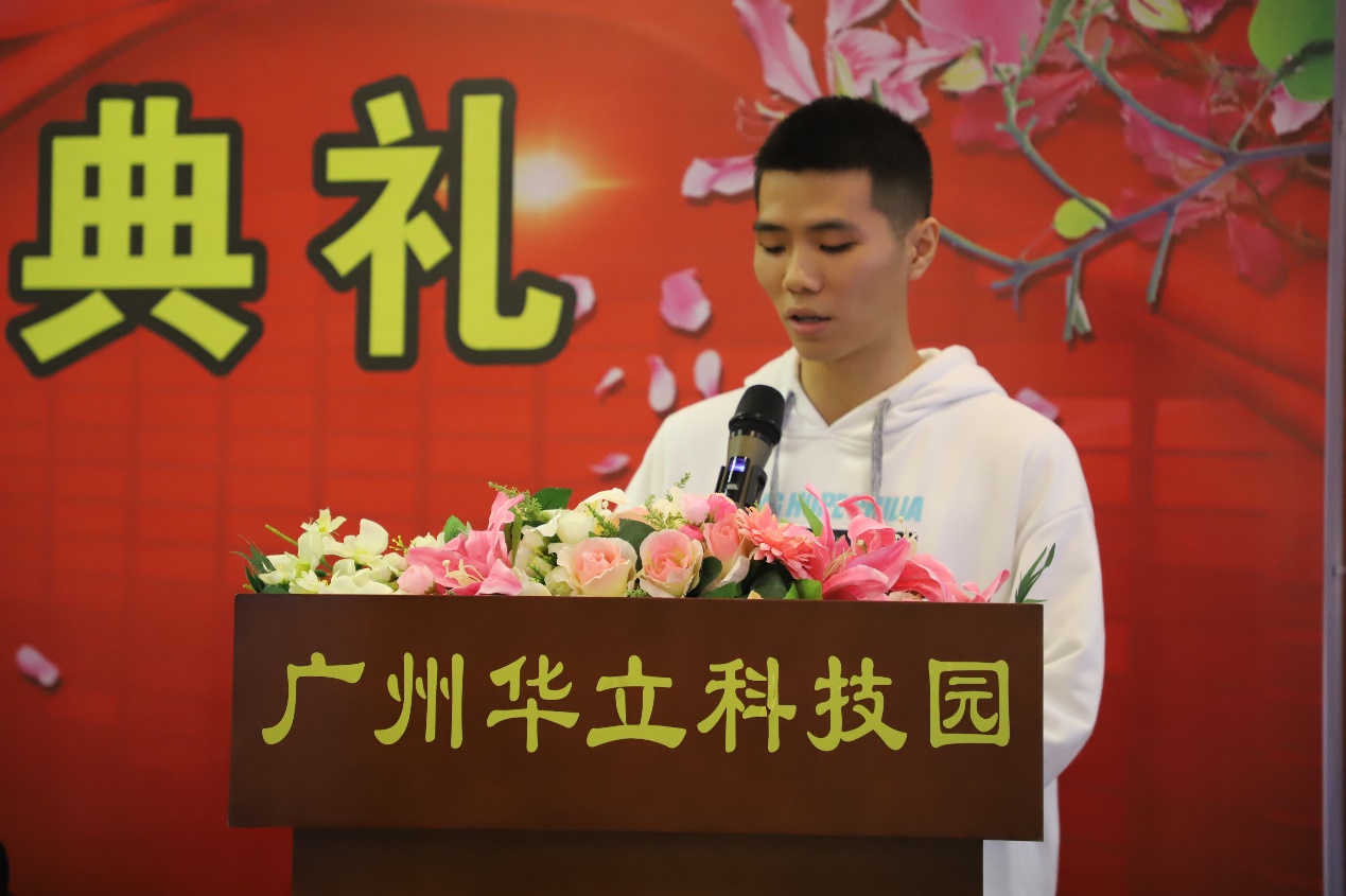 新生代表謝栩東代表全體新生發(fā)言。他感謝黨和國家給的這次機(jī)會,并表示將會努力完成學(xué)業(yè)、積極獲得學(xué)歷的決心和愿望。