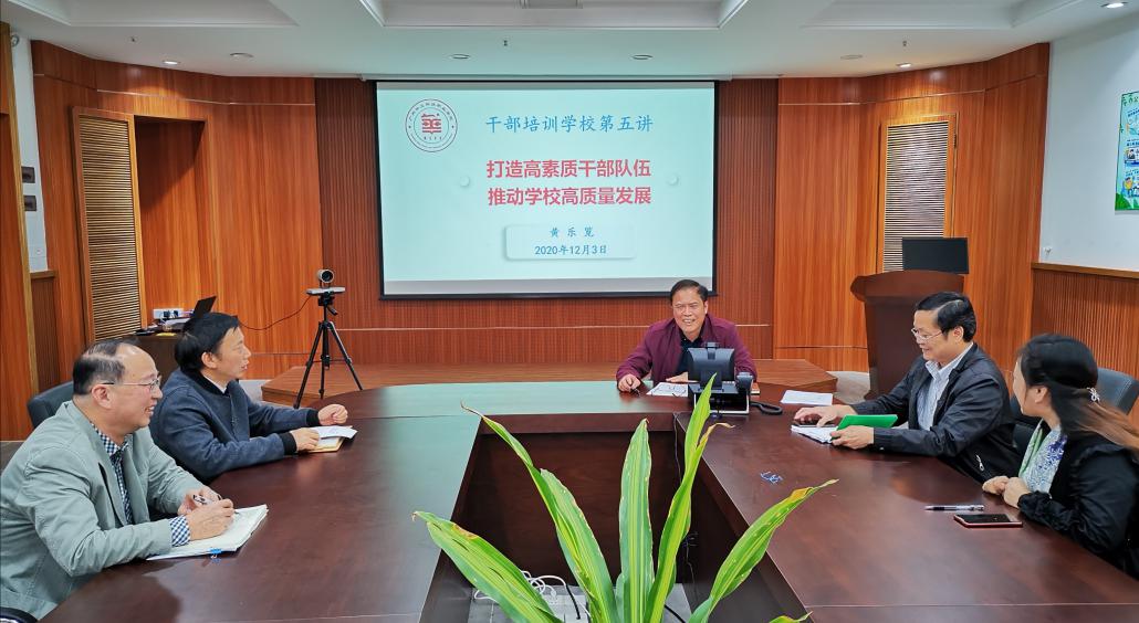 12月3日下午,我校廣州校區(qū)和云浮校區(qū)用視頻方式,舉辦了干部培訓(xùn)學(xué)校專題講座第五講——打造高素質(zhì)干部隊(duì)伍,推動(dòng)學(xué)校高質(zhì)量發(fā)展。講座由副校長(zhǎng)黃樂(lè)覽主講。第一期干部培訓(xùn)學(xué)員和部分中層領(lǐng)導(dǎo)參加了講座培訓(xùn)會(huì)。