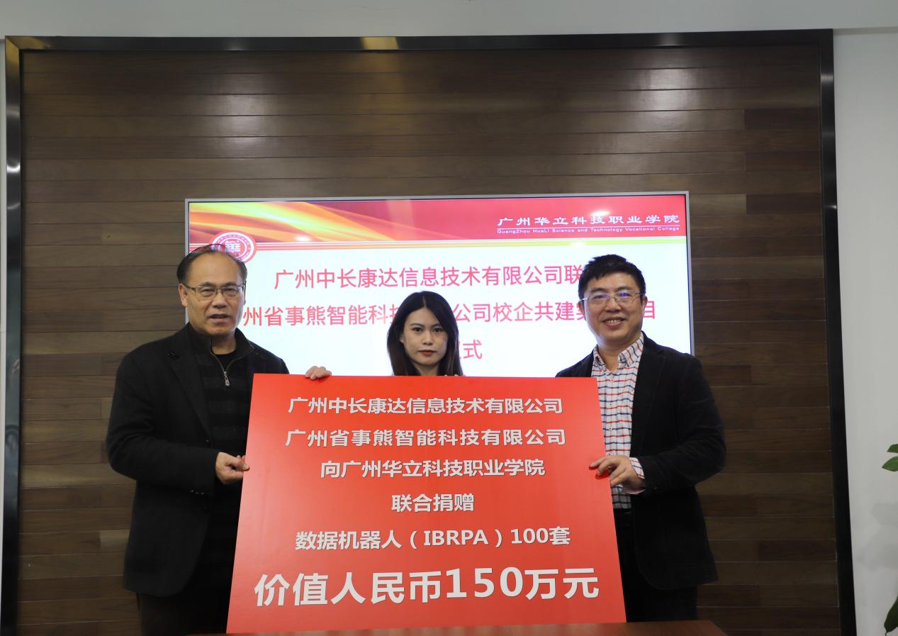 2020年12月29日下午,廣州中長(zhǎng)康達(dá)信息技術(shù)有限公司www.ibrpa.com(以下簡(jiǎn)稱“中長(zhǎng)康達(dá)”)聯(lián)合廣州省事熊智能科技有限公司(以下簡(jiǎn)稱“省事熊智能科技”)向我校捐贈(zèng)了100套價(jià)值150萬元的數(shù)據(jù)機(jī)器人(IBRPA)軟件,捐贈(zèng)儀式在我校行政樓301會(huì)議室舉行。
