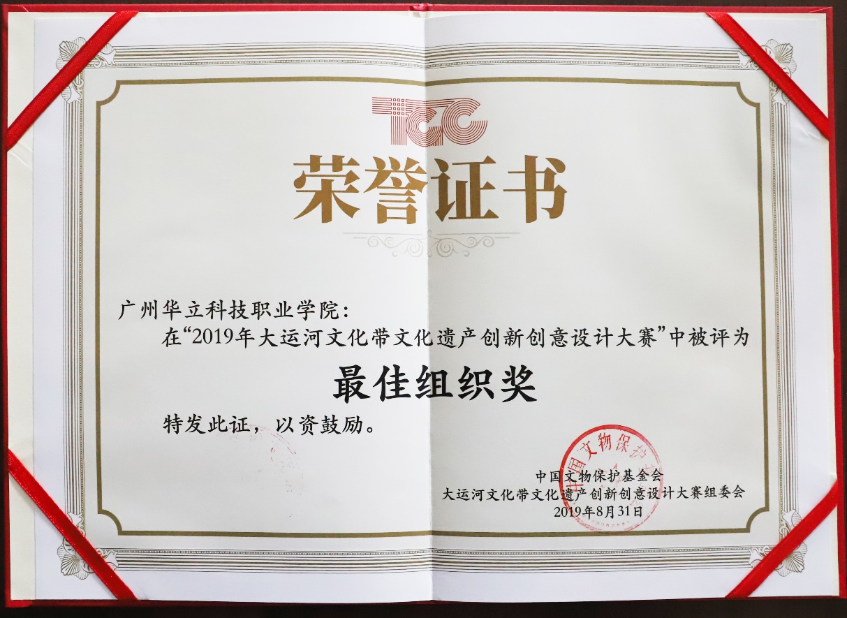 “大運(yùn)河文化帶文化遺產(chǎn)創(chuàng)新創(chuàng)意設(shè)計(jì)大賽”是由國家文物局指導(dǎo)、中國文物保護(hù)基金會主辦的國家級文創(chuàng)大賽。2019年8月,山東大學(xué)、廣州華立科技職業(yè)學(xué)院等12家院校及博物館組織工作出色,由大賽組委會授予最佳組織獎。