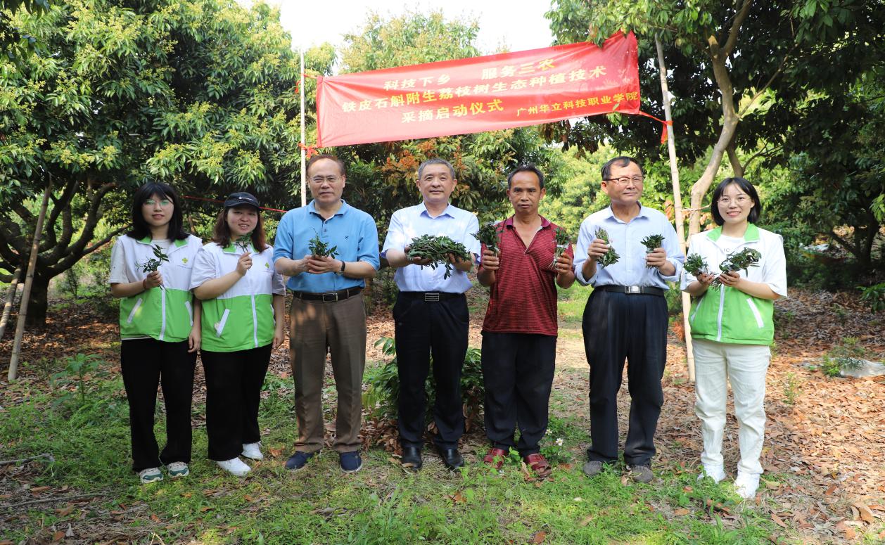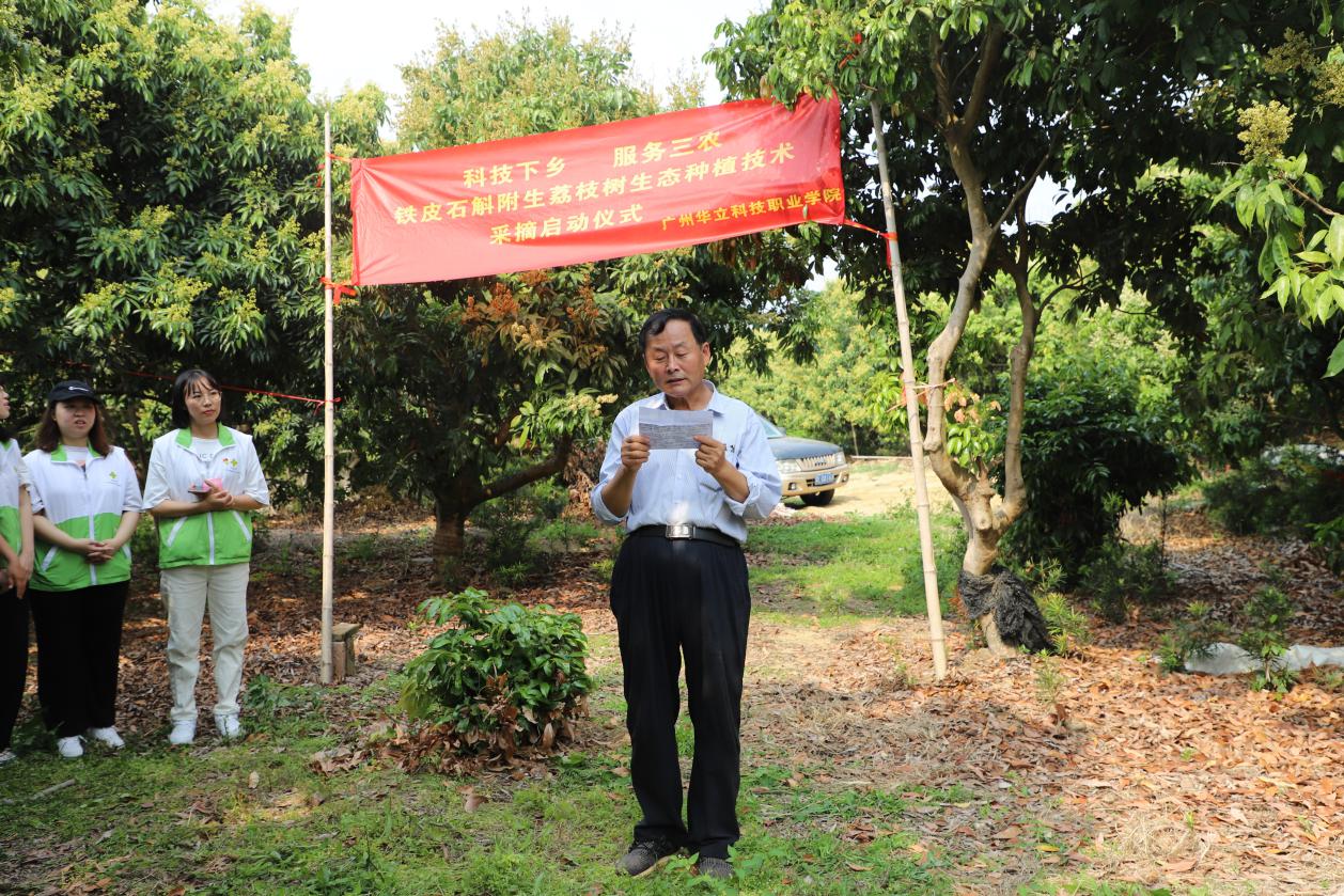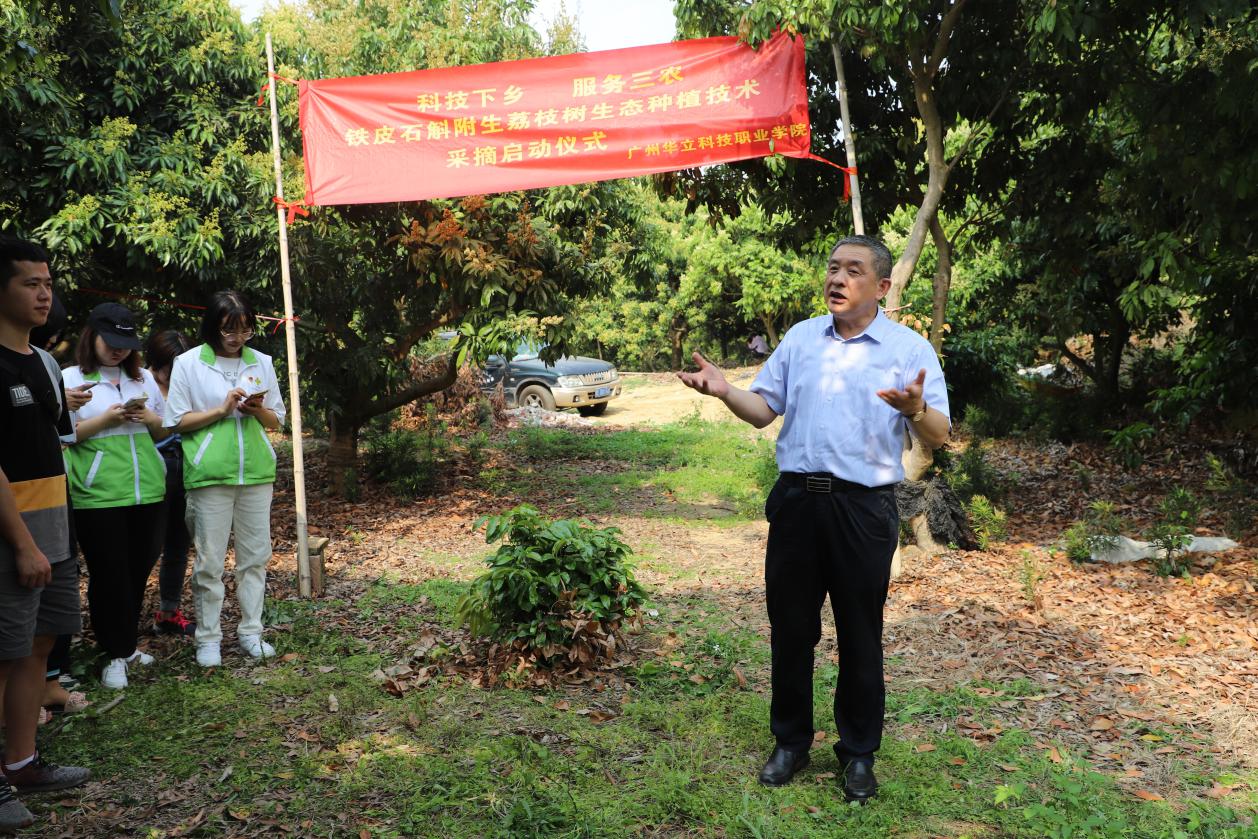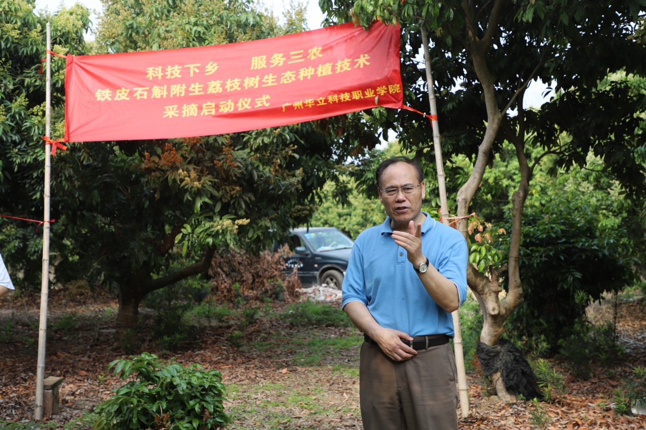 2021年3月18日,廣州華立科技職業(yè)學(xué)院校長劉莊教授、執(zhí)行校長馬龍海教授來到了《科技下鄉(xiāng) 服務(wù)三農(nóng) 鐵皮石斛附生荔枝樹生態(tài)種植技術(shù)采摘啟動(dòng)儀式》的現(xiàn)場,增江街社區(qū)工作服務(wù)站王凡主任、四豐村曾主任出席了采摘儀式,隨行的還有我校會(huì)計(jì)學(xué)院李哲教授,城建學(xué)院鄒筱平常務(wù)副院長、國貿(mào)學(xué)院隗波揚(yáng)副院長及部分師生代表。