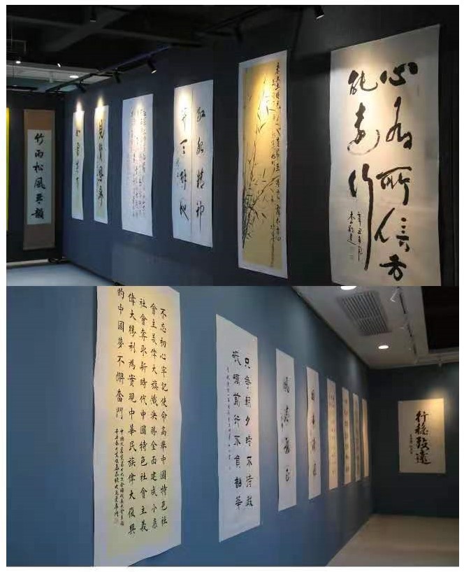 本次書畫展由廣州華立科技職業(yè)學(xué)院黨委主辦,以“千秋偉業(yè)、百年風(fēng)華“為主題 ,展出了近百幅作品,主題突出,內(nèi)容積極向上,藝術(shù)特色鮮明。廣東省書法家協(xié)會會員、廣東省直屬機關(guān)書法家協(xié)會副主席、華立職院黨委書記林偉健教授的“好大王隸書”書法作品憨態(tài)古樸、別具一格,其行草書法作品行云流水,流暢大度。校長劉莊教授書寫“立德樹人”,樸實端莊,引人注目。執(zhí)行校長馬龍海教授的篆書作品,曲中求圓,剛?cè)嵊卸?。副校長馬俊副教授為展覽設(shè)計的背景展板,雍容大氣,充滿藝術(shù)感。中國書法家協(xié)會會員、著名書法家林少榮先生特地為本次展覽書寫“不忘初心,牢記使命”和“清平樂.六盤山”作品,剛遒健勁,大氣淋漓。廣東省宋慶齡基金會常務(wù)副主席、廣東省直屬機關(guān)美術(shù)家協(xié)會副主席陳明的國畫“十方和諧”,知名畫家、書法家徐衛(wèi)民、李顯達、雷顯峰和謝耀明等精心繪寫的作品,更是為展覽增色增光。