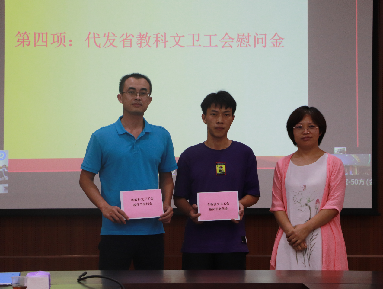 在今天隆重又簡樸的日子,省教科文衛(wèi)工會慰問我校困難教師,由學校代發(fā)慰問金。