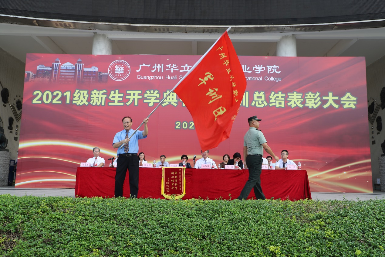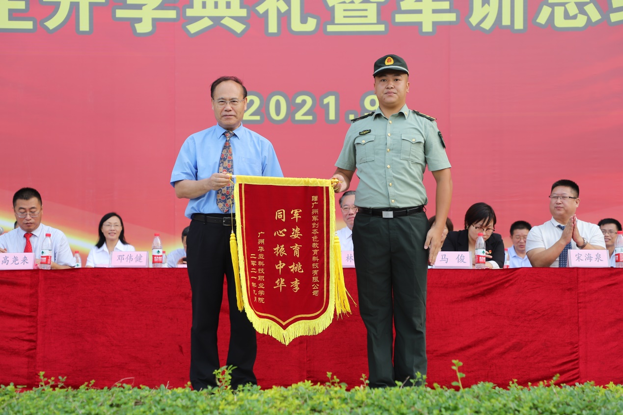 承訓(xùn)部隊(duì)向?qū)W校交回軍訓(xùn)團(tuán)團(tuán)旗,馬龍海執(zhí)行校長(zhǎng)接旗。學(xué)校向承訓(xùn)部隊(duì)贈(zèng)送錦旗。
