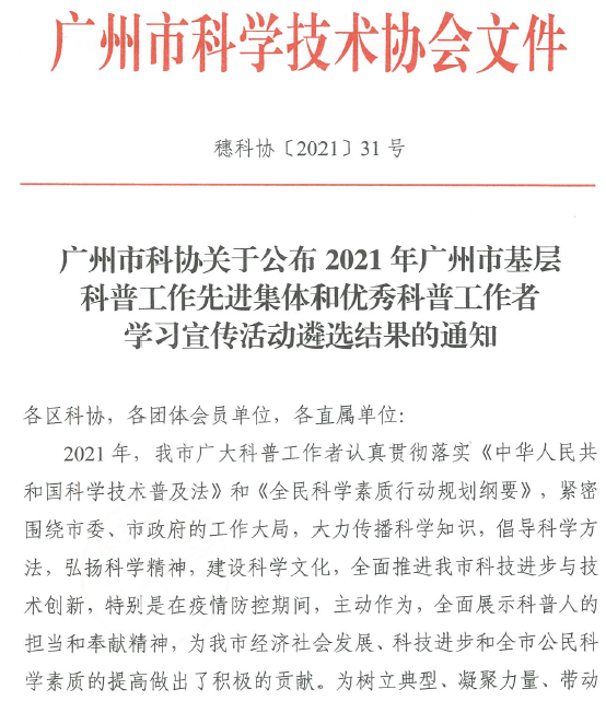 此次評選是廣州市在各區(qū)、街(鎮(zhèn))、社區(qū)(行政村)、學(xué)會(huì)(協(xié)會(huì)、研究會(huì))、企事業(yè)科協(xié)(含高校科協(xié))及市科協(xié)直屬單位專兼職科普工作者,科普專家,科普志愿者,農(nóng)村科普帶頭人中評選的,在科普領(lǐng)域做出突出貢獻(xiàn)的科技人才。共評選出優(yōu)秀科普工作者50名,其中企事業(yè)科協(xié)(含高??茀f(xié))限額10名,我校與華南師范大學(xué)、廣州大學(xué)地理科學(xué)與遙感學(xué)院、仲愷農(nóng)業(yè)工程學(xué)院、廣州科技貿(mào)易職業(yè)學(xué)院和廣州南洋理工職業(yè)學(xué)院的科普專家同獲殊榮。