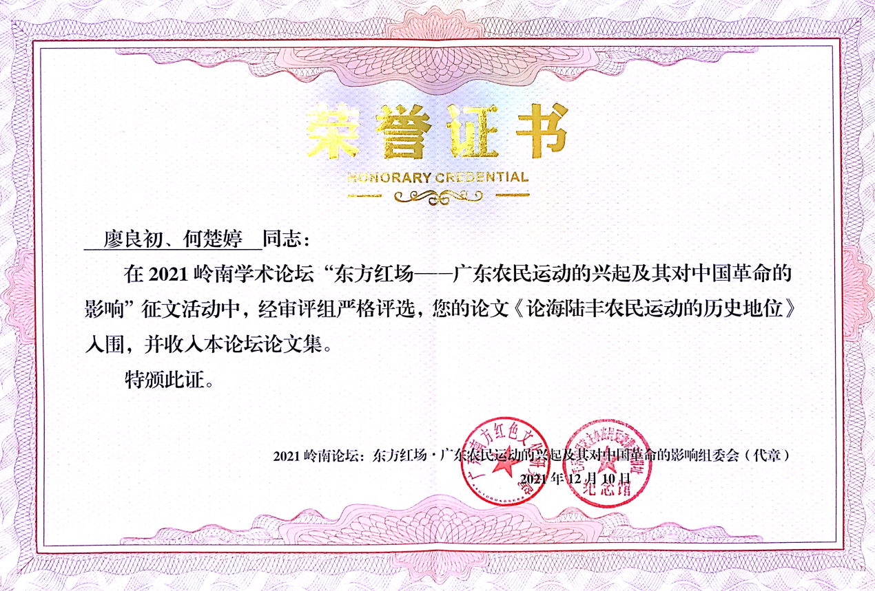 2021年嶺南學(xué)術(shù)論壇:“東方紅場·廣東農(nóng)民運動的興起及其對中國革命的影響”,由廣東省社會科學(xué)界聯(lián)合會、廣東南方紅色文化研究院、中山大學(xué)馬克思主義學(xué)院、華南師范大學(xué)馬克思主義學(xué)院、中共汕尾市委黨史研究室等單位聯(lián)合舉辦,目的是深入研究闡釋中國共產(chǎn)黨百年奮斗的歷史經(jīng)驗和智慧,進(jìn)一步推動廣東革命史研究,助力革命老區(qū)蘇區(qū),加快振興發(fā)展。本次學(xué)術(shù)論壇自2021年8月19日發(fā)出征文通知至11月5日截止,共收到全省各高校、省社科研究機構(gòu)、省黨史研究部門等研究人員提交的學(xué)術(shù)論文131篇。研究會論文專家評審小組采用匿名方式,經(jīng)過“查重”、匿名審讀、終評審定等環(huán)節(jié),最后評出62篇優(yōu)秀論文入圍,并編輯成冊。我校廖良初、何楚婷兩位老師合寫的“論海陸豐農(nóng)民運動的歷史地位”,被評為優(yōu)秀入圍論文,并編入大會論文集進(jìn)行交流。