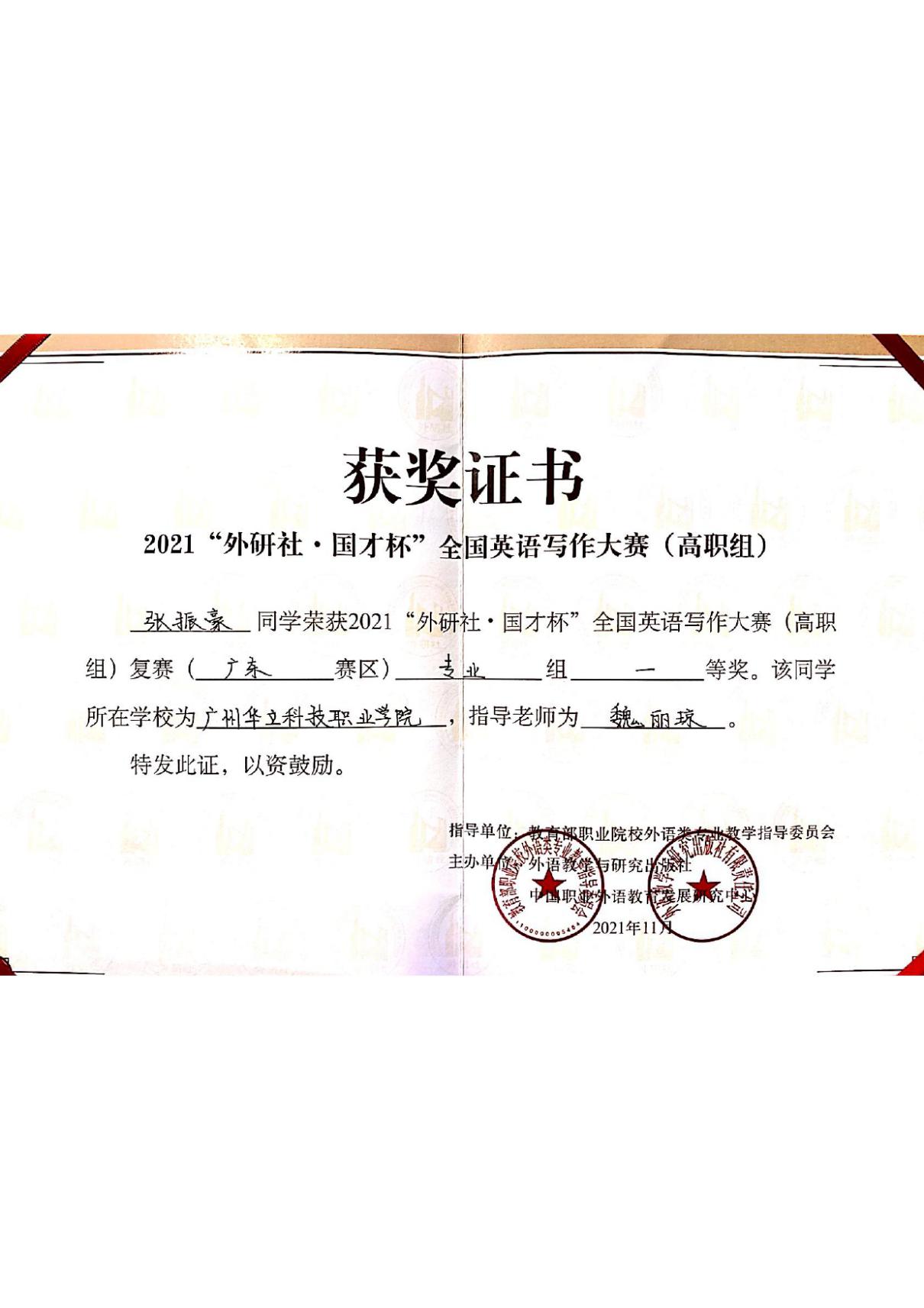 張振豪同學(xué)獲2021“外研社·國(guó)才杯”全國(guó)英語(yǔ)寫(xiě)作大賽(高職組)復(fù)賽(廣東賽區(qū))專業(yè)組一等獎(jiǎng)