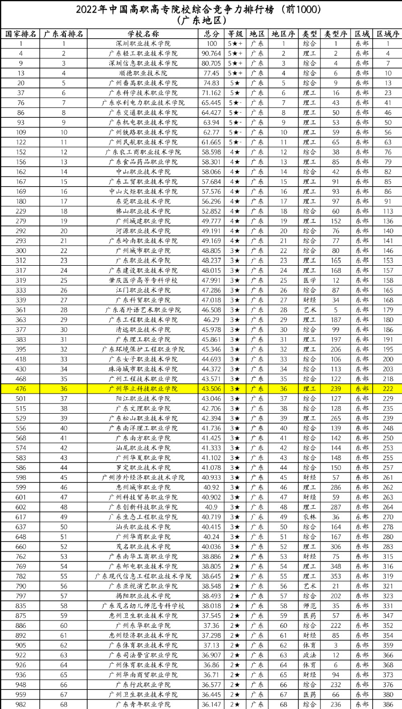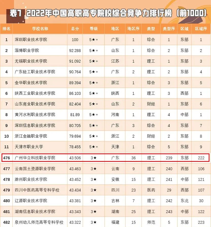 近日,在2022年“金平果排行榜”(中評榜)中國高職高專院校綜合競爭力排行榜(1000強)中,我校在全國1484所高職中排名476,廣東省第36,廣東民辦高職院校中排名第三,廣東省排名前三的另兩所高職高專院校分別是廣州城建職業(yè)學院(279名)、廣東嶺南學院(293)。其他民辦院校排名為廣州南洋理工職業(yè)學院(556)、廣州華夏職業(yè)學院(583)、廣州涉外經濟職業(yè)技術學院(598)、廣州華商職業(yè)學院(648)。