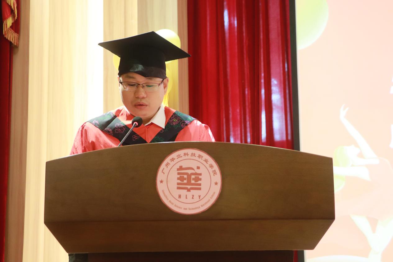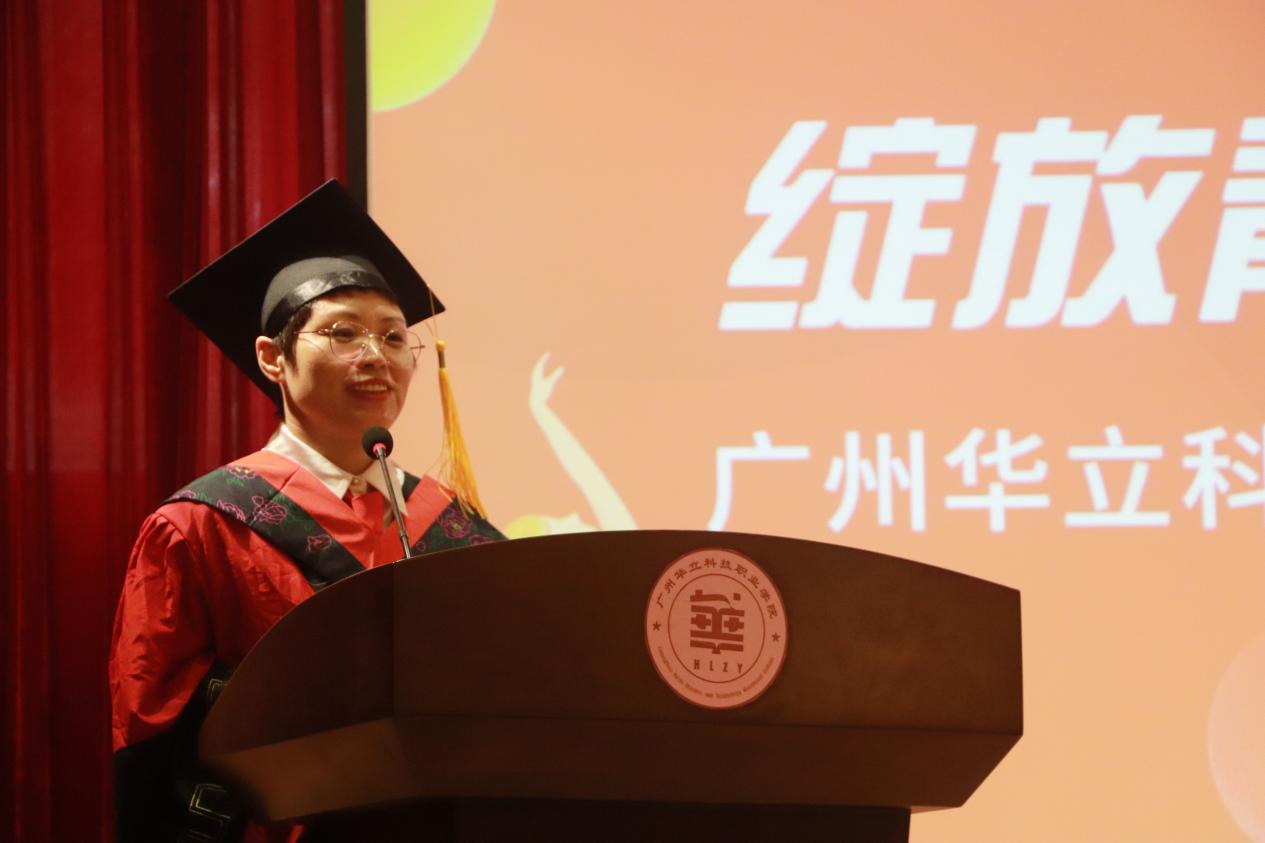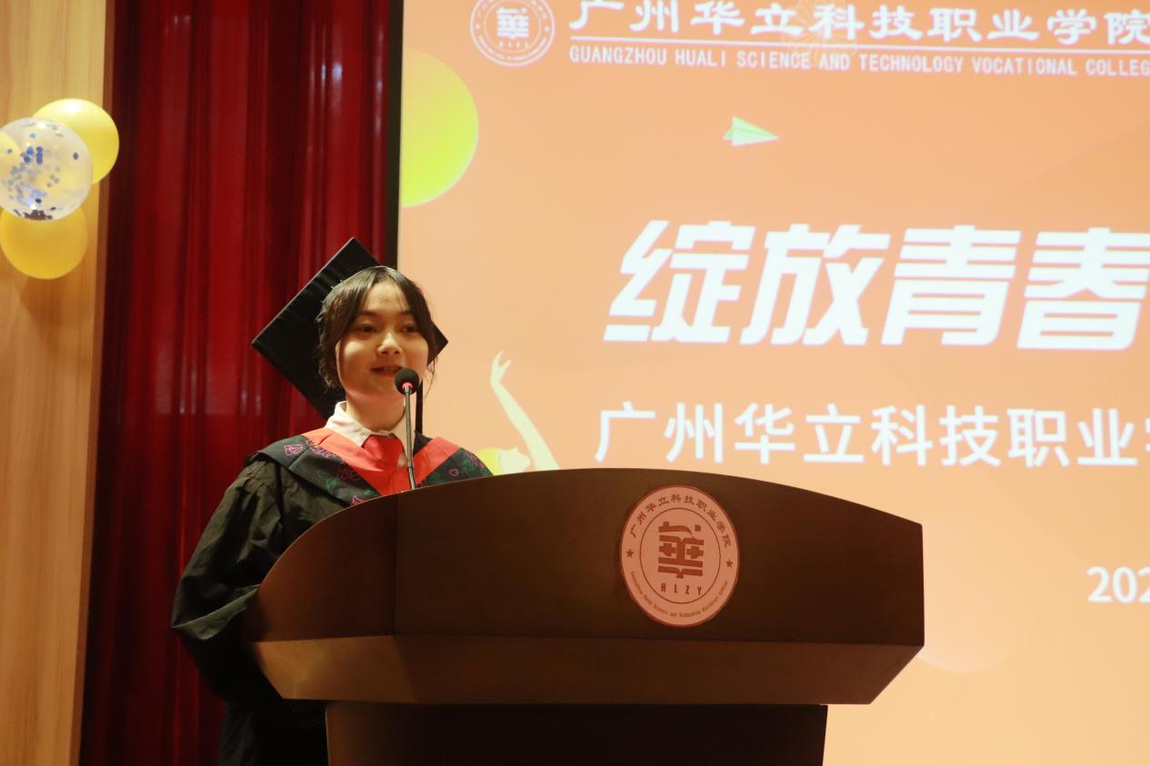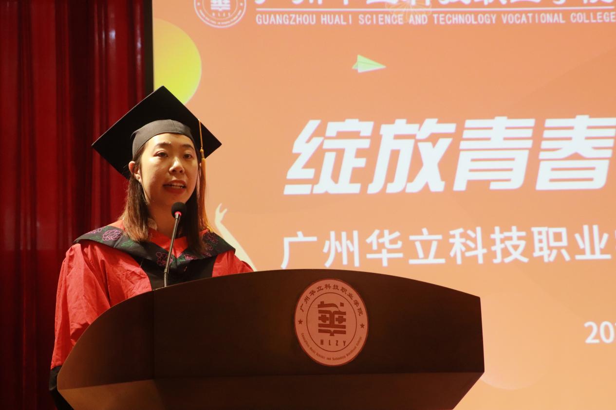 畢業(yè)生代表林紫媚與全體畢業(yè)生一起回顧了在華立三年的求學(xué)歷程,并代表全體畢業(yè)生表達(dá)了對母校與師長感恩之情。她號召所有畢業(yè)生要秉承“厚德、務(wù)實、強能、創(chuàng)新”的校訓(xùn),懷揣夢想,勤于實踐,勇敢前行,在不同的工作崗位上為母校增添光彩。