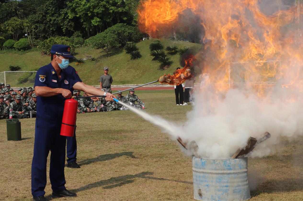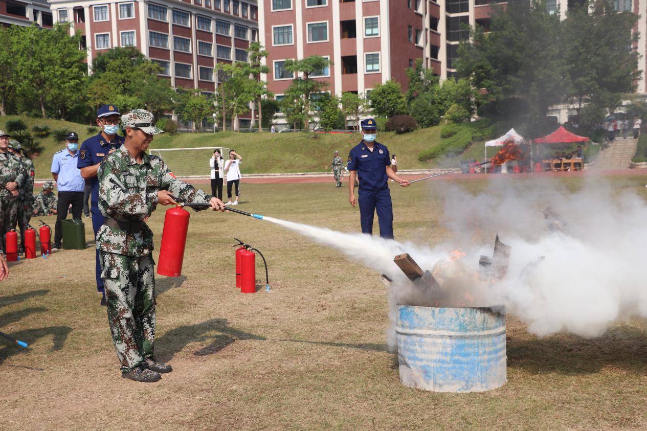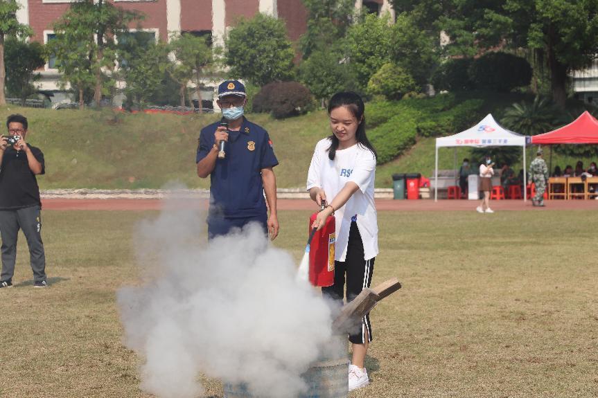 隨后,在消防特勤隊員的指導(dǎo)下,部分師生員工代表親身實踐體會使用滅火器滅火的過程。面對熊熊燃燒的火堆,師生代表們神情專注、沉著應(yīng)對,正確地按照滅火的步驟和方法,將汽油燃起的濃煙大火成功的迅速撲滅。本次參與演練的師生員工都得到很好的技能鍛煉與消防知識提升,演練活動達(dá)到預(yù)期效果。