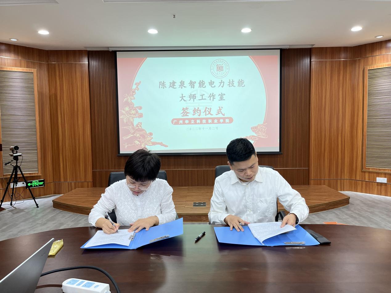 (王洪艷副校長與陳建泉進(jìn)行智能電力技能大師工作室簽約儀式)