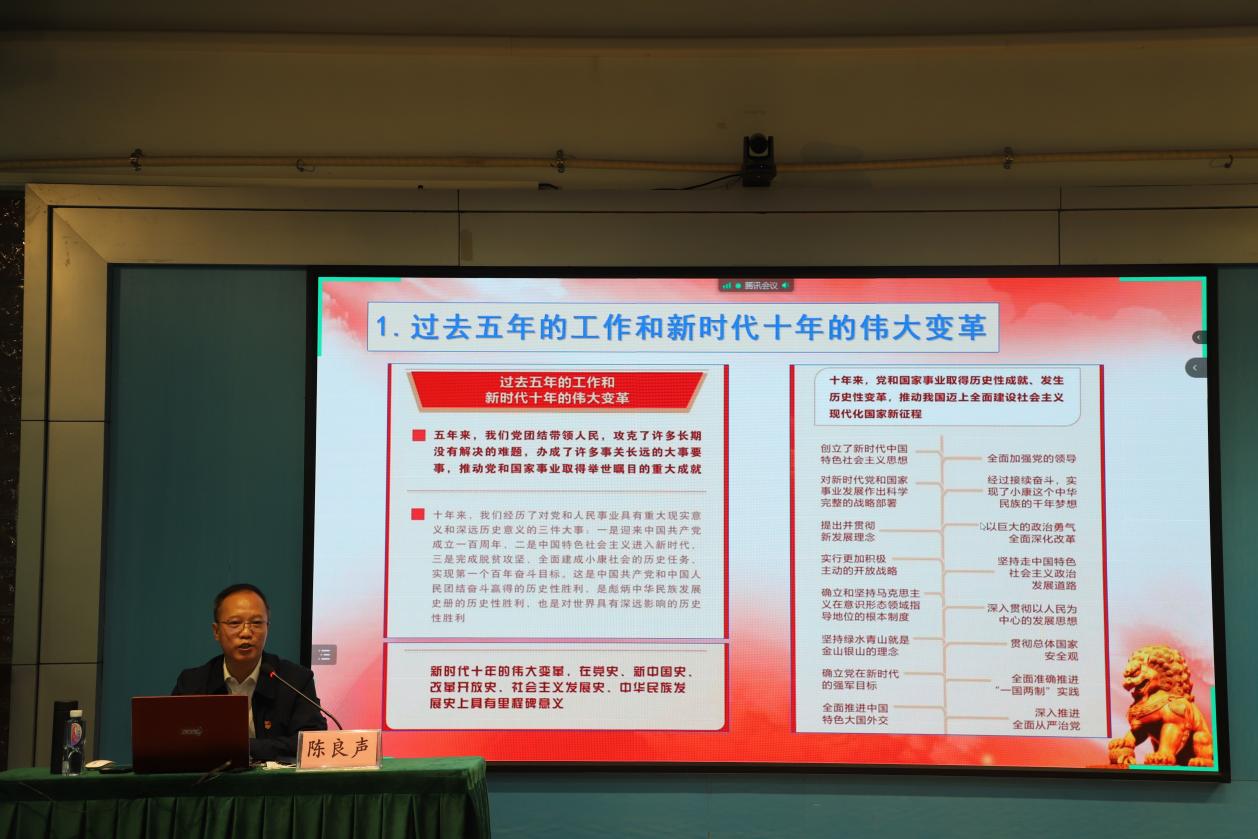 中國(guó)共產(chǎn)黨第二十次全國(guó)代表大會(huì)于今年10月16日至22日在北京舉行。為在我校迅速掀起學(xué)習(xí)宣傳貫徹黨的二十大精神的熱潮,11月2日下午,我校黨委理論學(xué)習(xí)中心組(擴(kuò)大)在圖書館104舉行學(xué)習(xí)會(huì),由學(xué)校黨委書記陳良聲進(jìn)行領(lǐng)學(xué)。
