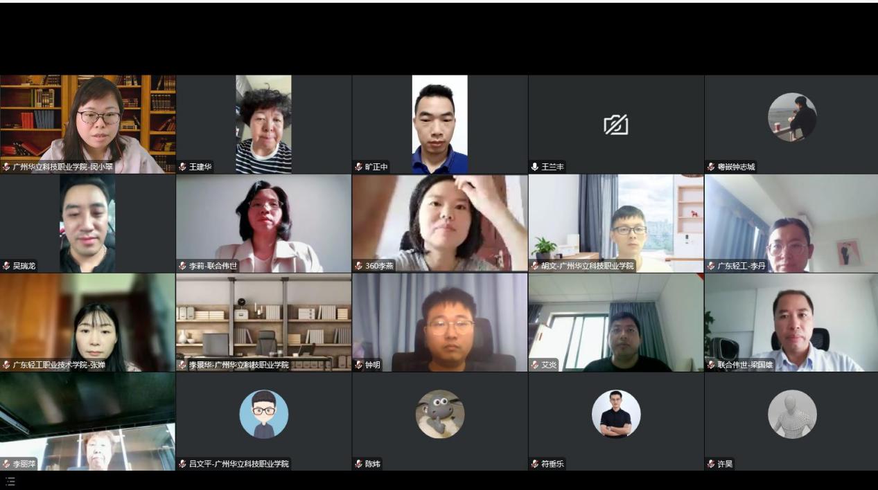 2022年11月21日上午,計(jì)算機(jī)學(xué)院組織召開22級人才培養(yǎng)方案論證會,此次會議連線云浮校區(qū)。邀請廣東輕工職業(yè)技術(shù)學(xué)院信息技術(shù)學(xué)院教學(xué)副院長張嬋、工業(yè)軟件教研室翟鴻雁教授、云計(jì)算教研室李丹主任、智能產(chǎn)品教研室艾炎主任、人工智能教研室許昊主任,中國高科集團(tuán)股份有限公司產(chǎn)教融合事業(yè)部華南區(qū)負(fù)責(zé)人吳瑞龍先生,北京聯(lián)合偉世科技股份有限公司教研總監(jiān)李莉女士、北京聯(lián)合偉世科技股份有限公司銷售總監(jiān)梁國雄先生,360集團(tuán)高級銷售經(jīng)理李燕女士,廣州粵嵌通信科技股份有限公司鐘志誠先生,廣東宏圖信息技術(shù)有限公司曠正中先生參加線上討論。學(xué)院院長王建華教授、學(xué)科帶頭人李麗萍教授、教學(xué)主任閔小翠副教授以及各系主任等參加會議。會議由行政副主任王蘭豐老師主持。