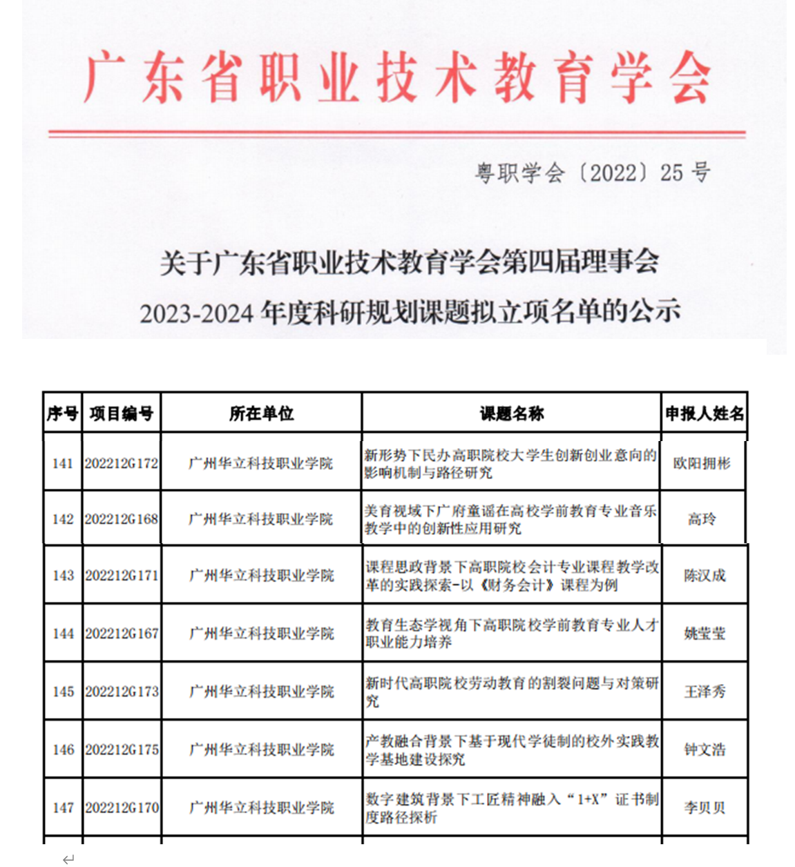 本次我校共申報(bào)了廣東省職業(yè)技術(shù)教育學(xué)會2023-2024年度科研規(guī)劃課題9項(xiàng),通過精心組織、學(xué)校推薦共立項(xiàng)7項(xiàng),充分體現(xiàn)了我校承擔(dān)省級科研項(xiàng)目的能力和競爭力顯著增強(qiáng)。近年來,學(xué)??蒲刑?/span>加大對縱向科研項(xiàng)目申報(bào)的組織指導(dǎo)和項(xiàng)目管理,不斷提升教師創(chuàng)新能力和科研水平。2023年學(xué)校將依托省級科研課題,爭取更多標(biāo)志性成果。