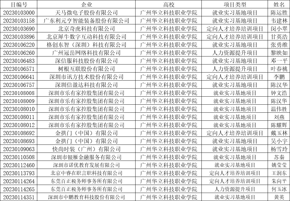 2023年4月6日,教育部發(fā)布了《教育部高校學(xué)生司關(guān)于公布第二期供需對接就業(yè)育人項(xiàng)目立項(xiàng)名單的通知》 (教學(xué)司函〔2023〕6號),廣州華立科技職業(yè)學(xué)院申請的24個(gè)項(xiàng)目立項(xiàng)成功,其中就業(yè)實(shí)習(xí)基地項(xiàng)目15項(xiàng),定向人才培養(yǎng)培訓(xùn)項(xiàng)目6項(xiàng),人力資源提升項(xiàng)目3項(xiàng),立項(xiàng)為全省民辦高校第一名。