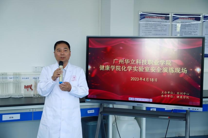 為認(rèn)真貫徹落實《廣東省教育廳轉(zhuǎn)發(fā)教育部辦公廳關(guān)于印發(fā)《高等學(xué)校實驗室安全規(guī)范》的通知》的文件精神,切實提高師生實驗室安全意識,確?;瘜W(xué)實驗室的安全性,提高學(xué)校實驗室突發(fā)事件的應(yīng)急處置能力。4月18日上午,由實訓(xùn)中心主辦,健康學(xué)院承辦的化學(xué)實驗室安全演練在西2-207室舉行。學(xué)校董事長助理李引章,黨委副書記、副校長高堯來,校長助理葉春桃,各二級學(xué)院(二級部門)負(fù)責(zé)人、實驗室負(fù)責(zé)人、實訓(xùn)中心、保衛(wèi)處、總務(wù)處、學(xué)生處、教務(wù)處及其他專業(yè)的教師代表和學(xué)生代表參加了本次演練,本次演練由健康學(xué)院許小玲老師和2021級藥學(xué)吳丹婷同學(xué)主持。