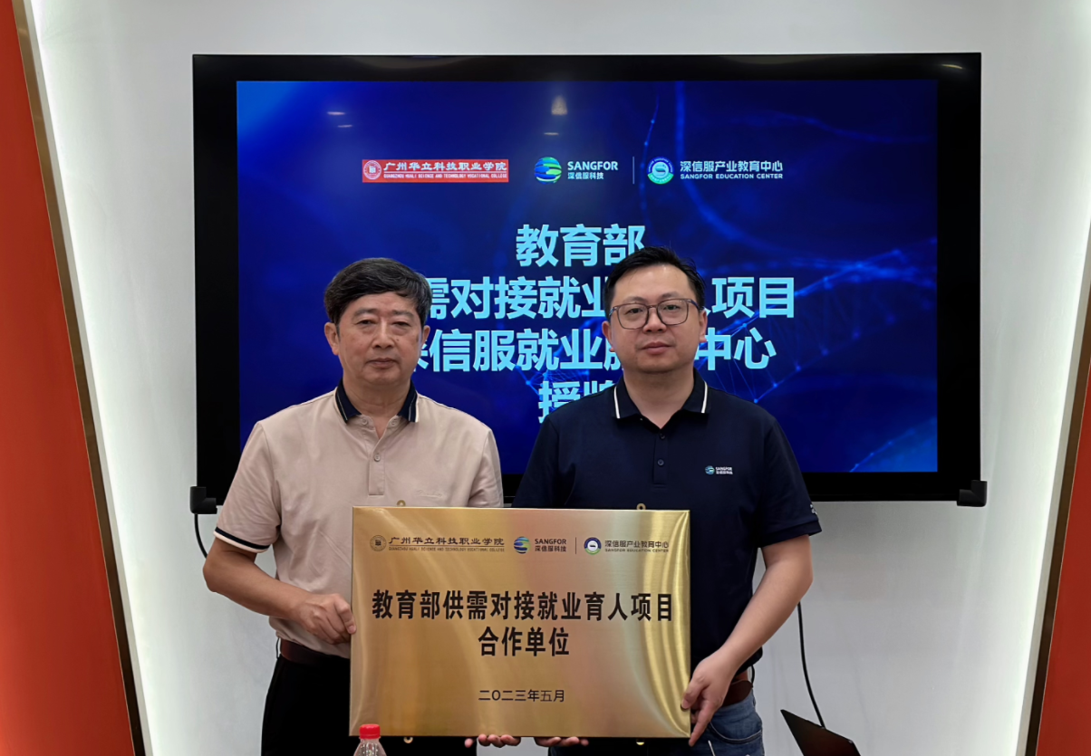 隨后,校企雙方舉行合作揭牌儀式。廣州華立科技職業(yè)學院校長易健民、深信服產(chǎn)教融合部負責人呂沐陽共同為“教育部供需對接就業(yè)育人項目合作單位”,校長助理張劍鋒、深信服廣州分公司副總經(jīng)理黃福印共同為“深信服就業(yè)服務中心”揭牌。
