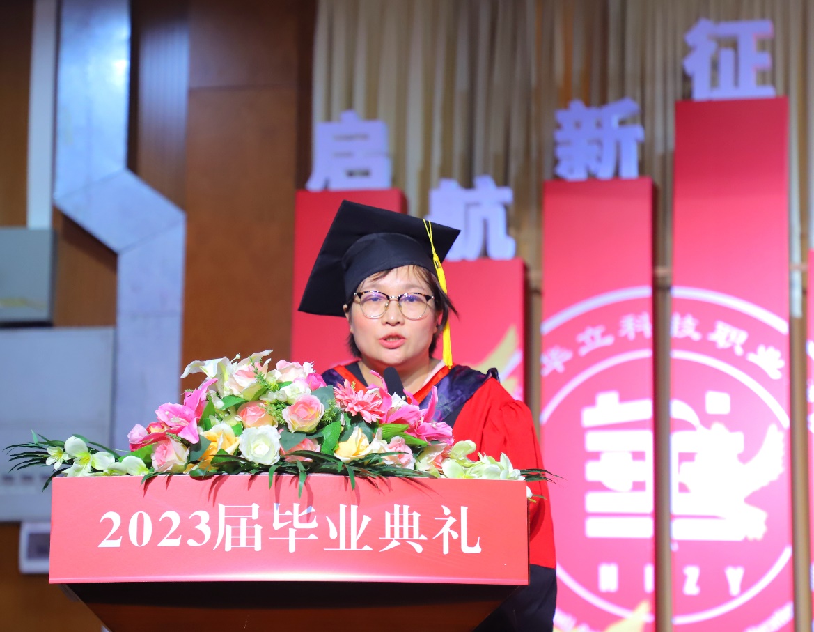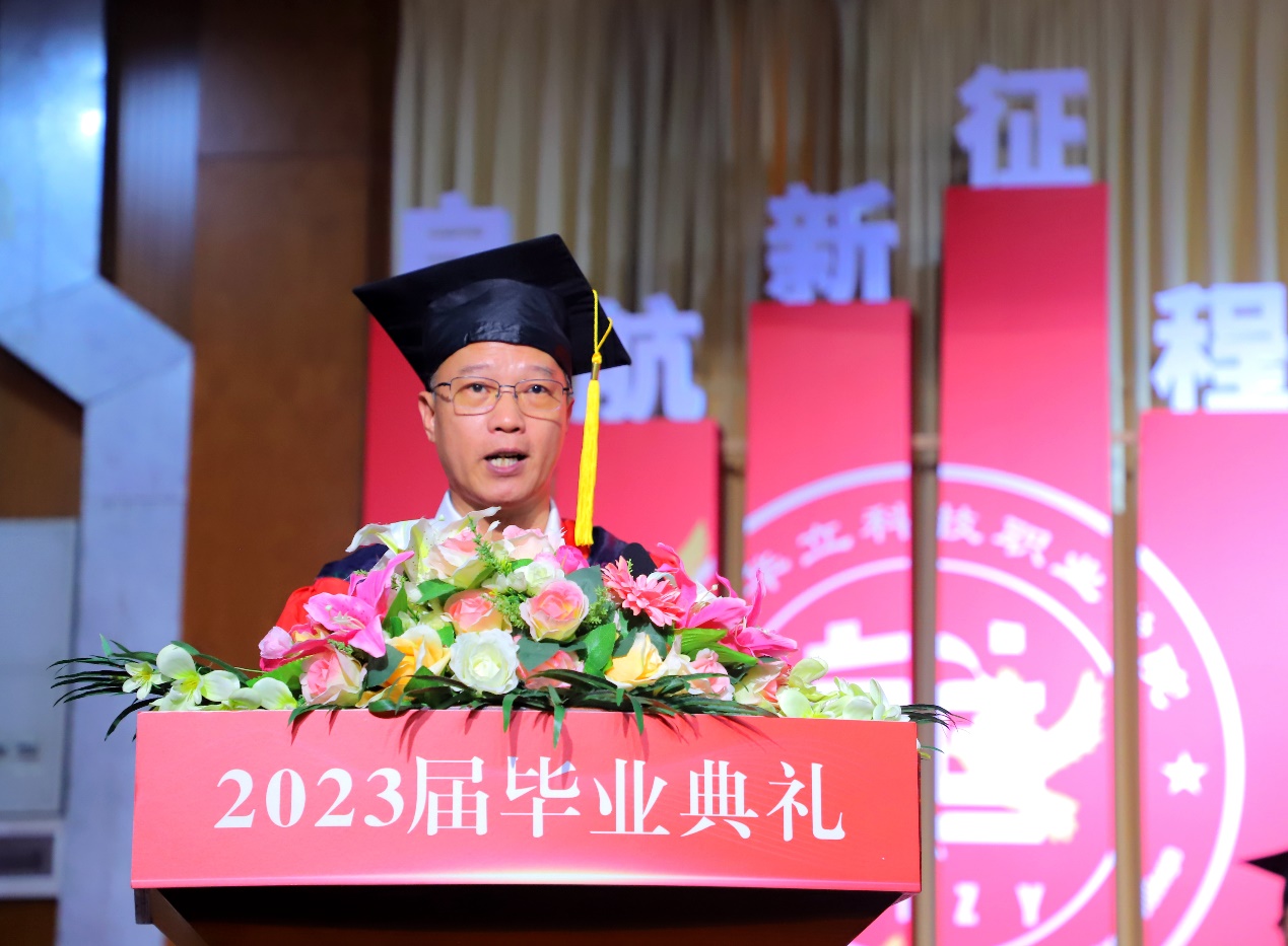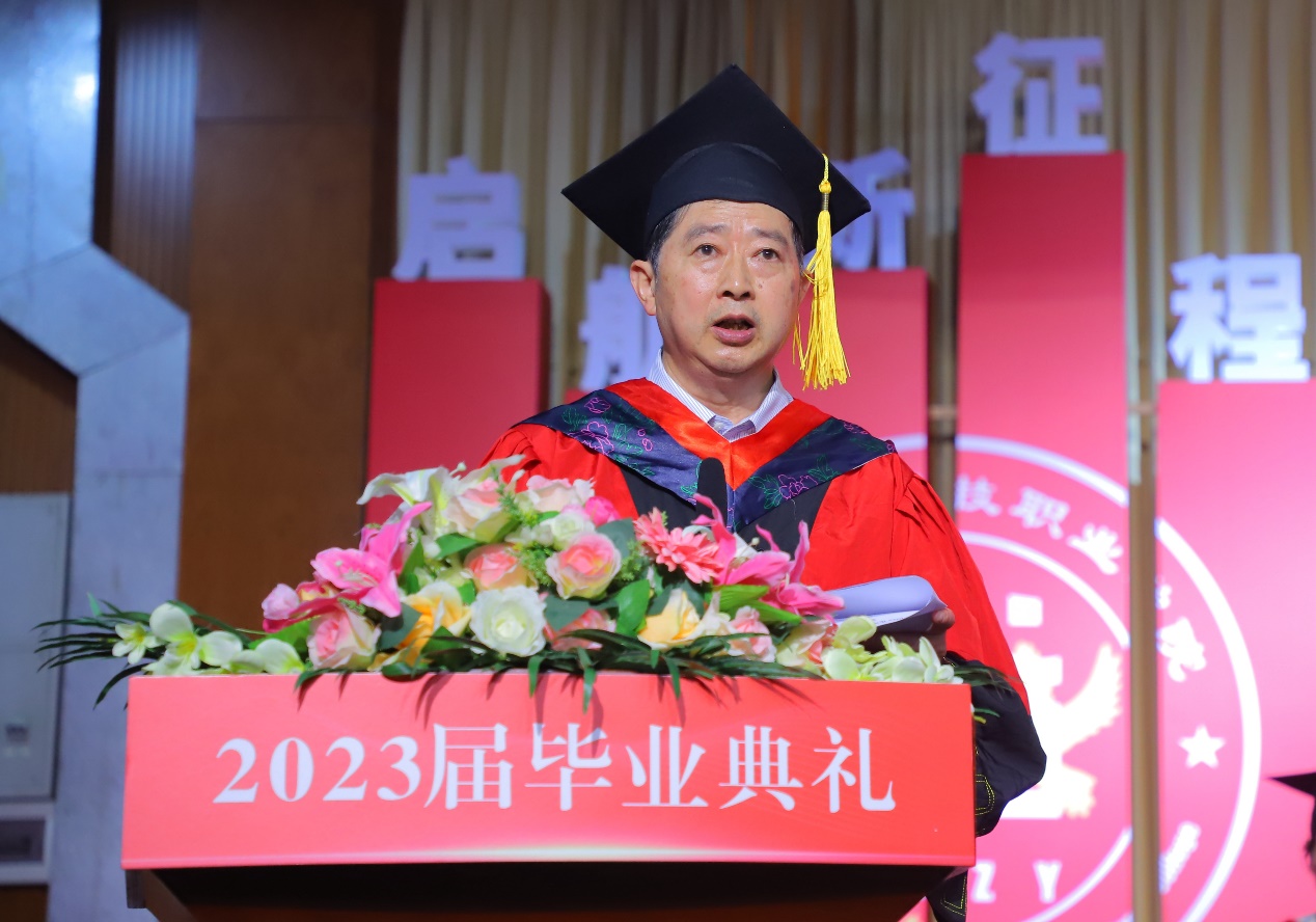 易健民校長對2023屆畢業(yè)生表示了最熱烈的祝賀和最深情的祝福。在即將離開校園,開啟嶄新的人生之旅之際,易校長寄語畢業(yè)生們要牢記“志存高遠,實現(xiàn)自我價值”,要堅持“終身學習,造就無悔人生”,要“勇于實踐,報效國家社會” 。易校長希望同學們踏進社會后要虛心向能工巧匠學習,掌握技術(shù)要領(lǐng),傳承“秘籍”“竅門”;又要敢于突破條條框框,大膽革新創(chuàng)造,把每一道工序、每一個項目、每一項工程做細、做實、做精、做出彩,在平凡的工作崗位上創(chuàng)造不平凡的業(yè)績,以優(yōu)異的技能報效祖國、回饋社會。期待畢業(yè)生們勇敢的放飛青春的夢想,在新征途上展翅高飛。