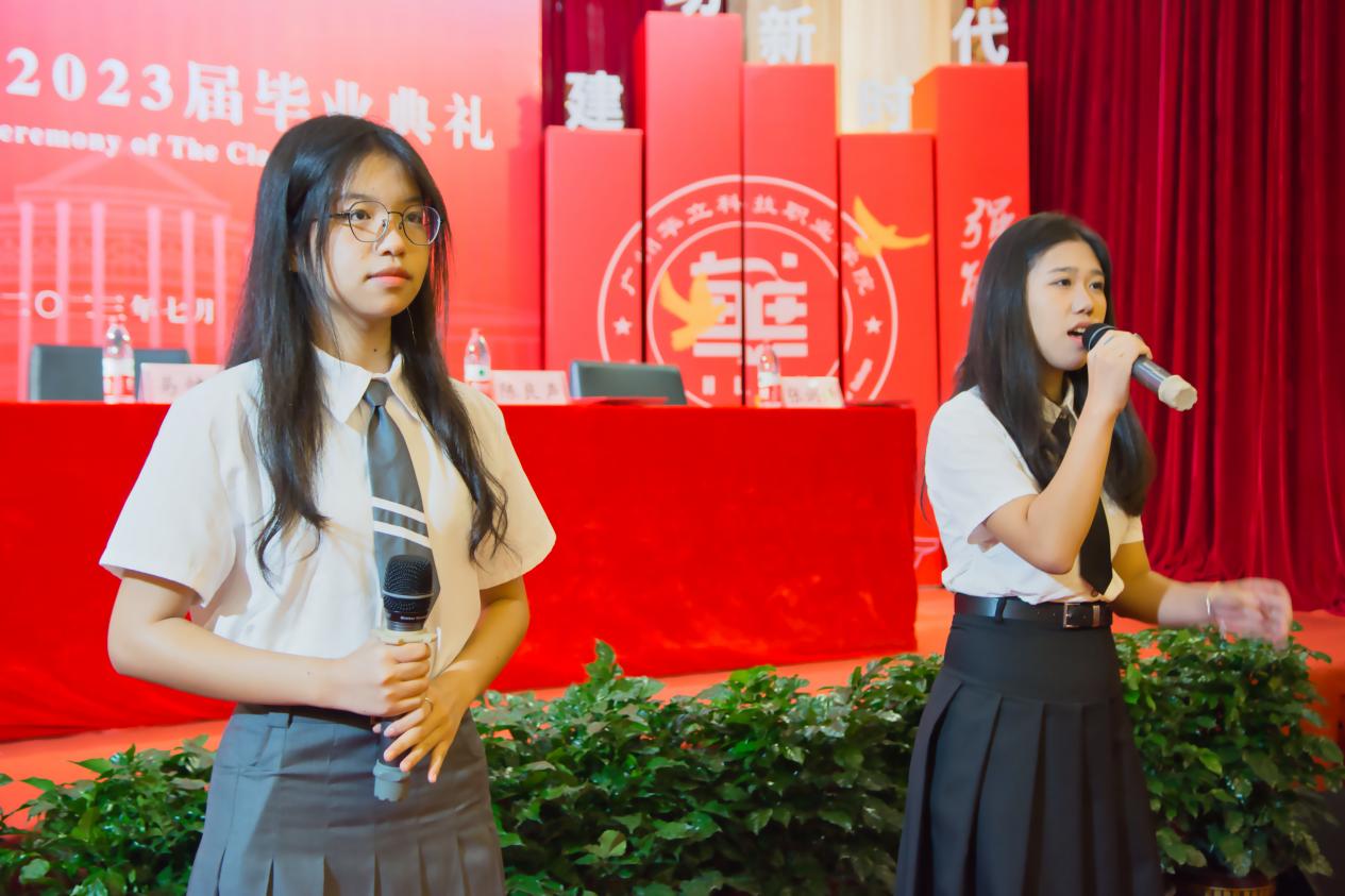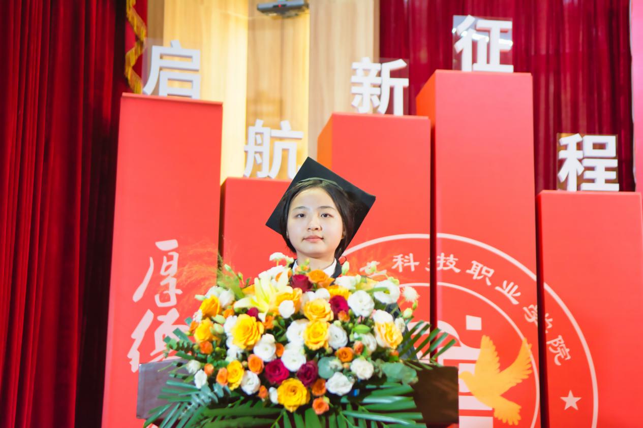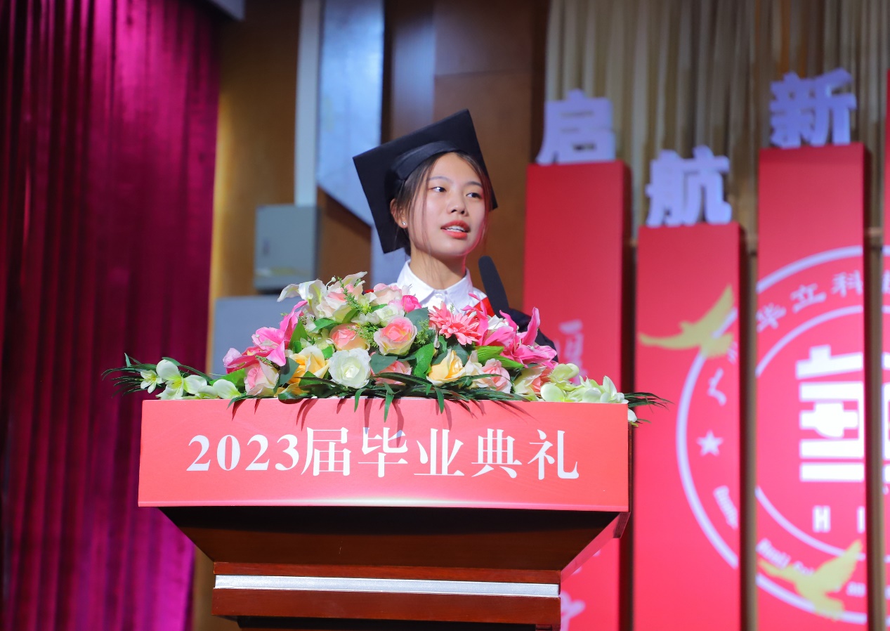 教育學院的謝梓婷同學代表2023屆全體畢業(yè)生進行發(fā)言。她說到,感謝學校的悉心栽培,母校生活不只豐富了我們的知識,提升了我們的技能,更磨煉了我們的意志。感恩母校給予我們一個又一個登高望遠的階梯,讓我們有能力有底氣站到更高的舞臺,不斷成長。表示自己會一直銘記“厚德 強能 務(wù)實 創(chuàng)新”的校訓,并身體力行。經(jīng)濟管理學院畢業(yè)生代婷婷發(fā)言時回顧自己大學三年的學習生活。她表示,要用行動和奮斗書寫屬于新時代華立人的多彩篇章。