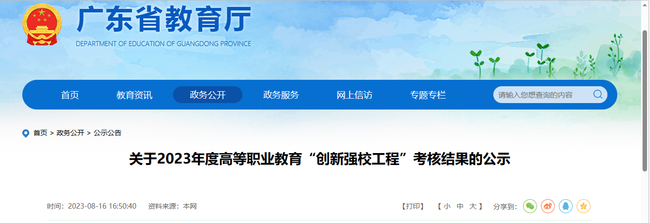 日前,省教育廳公示了2023年度廣東省高職院校“創(chuàng)新強(qiáng)校工程“考核結(jié)果,全省共90所高職院校接受考核。我校綜合得分82.09分,創(chuàng)歷史新高,較2022年度提高7.95分,在全省B類規(guī)劃高職院校中排名第六,B類民辦高職院校排名第一,充分彰顯了我校綜合辦學(xué)實(shí)力和人才培養(yǎng)水平。