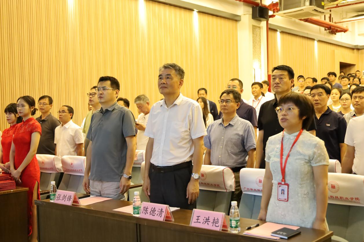 9月7日下午,在第39個教師節(jié)到來之際,廣州華立科技職業(yè)學(xué)院“躬耕教壇,強國有我”教師節(jié)表彰大會和2023年師德建設(shè)主題教育月活動啟動儀式采用兩校區(qū)視頻連線的方式,分別在廣州校區(qū)1號報告廳和云浮校區(qū)圖書館禮堂同步舉行。學(xué)校工會主席、常務(wù)副校長馬俊主持大會。
