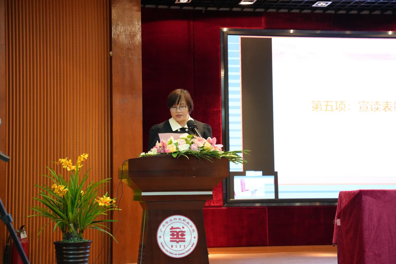 優(yōu)秀教育工作者代表李艷華老師在發(fā)言中感謝學(xué)校領(lǐng)導(dǎo)肯定和鼓勵;感謝兄弟部門的支持以及評建辦各位同事的精誠合作。她指出,我校2023年創(chuàng)強考核取得歷史性重大突破,高居同類院校排名第一!同時,在學(xué)校領(lǐng)導(dǎo)的高度重視和全體師生的共同努力下,學(xué)校成功獲批廣東省高校中華優(yōu)秀傳統(tǒng)文化傳承基地,打造了華立職院“文化傳承”的亮麗名片。總結(jié)點滴進步和成績,李老師感慨:作為一名教育工作者,重要的是擁有一顆恭敬之心,即對黨的教育事業(yè)的恭敬,對自身崗位的恭敬,對每一項任務(wù)和每一件事情的恭敬。有了敬業(yè)敬事之心,就不敢懈怠,時時不忘提醒自己努力努力再努力,踏踏實實工作,日新又新,不斷超越自己。