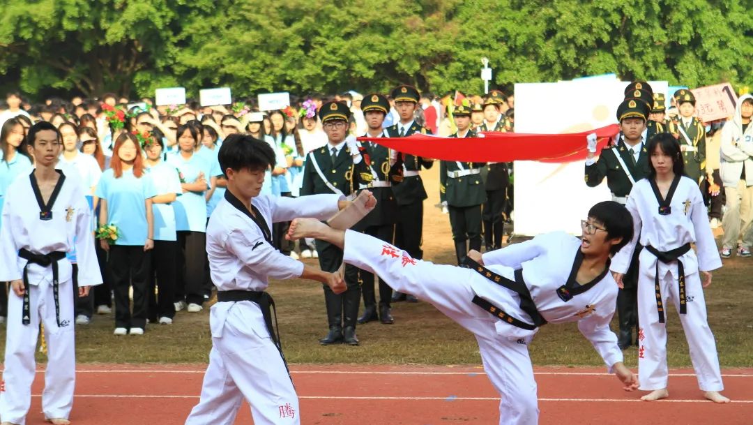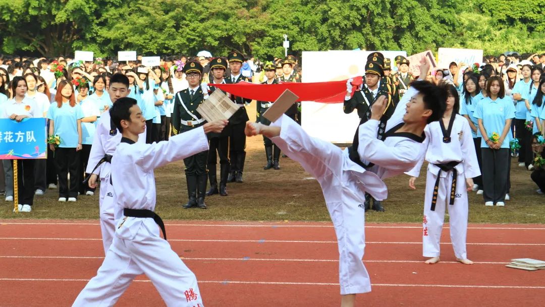 開幕式上,國(guó)旗護(hù)衛(wèi)隊(duì)、鮮花方隊(duì)、紅旗方隊(duì)、機(jī)關(guān)教師代表隊(duì)、各二級(jí)學(xué)院師生代表隊(duì)、志愿者方隊(duì)和裁判員方隊(duì)伴隨著歡樂的音樂依次入場(chǎng)。虎虎生風(fēng)的旗幟、鏗鏘有力的步伐、響徹云霄的口號(hào),充分展現(xiàn)了全校師生自強(qiáng)自信、拼搏奮進(jìn)、團(tuán)結(jié)向上、樂觀積極的精神風(fēng)貌。最后,國(guó)防教育協(xié)會(huì)、跆拳道協(xié)會(huì)、街舞協(xié)會(huì)的精彩表演將開幕式推向了高潮。
