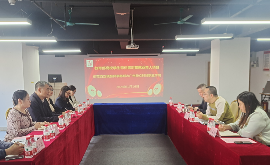 在校企供需對(duì)接中為進(jìn)一步深化校企合作、產(chǎn)教融合工作,了解行業(yè)發(fā)展新趨勢(shì),為我校財(cái)經(jīng)類學(xué)生提供更多、更好的實(shí)習(xí)實(shí)踐機(jī)會(huì)。1月16日上午,廣州華立科技職業(yè)學(xué)院陳德清校長(zhǎng)率經(jīng)管學(xué)院院長(zhǎng)梁慧貞、副院長(zhǎng)朱向平及教師代表一同前往東莞百正稅務(wù)師事務(wù)所開展訪企拓崗促就業(yè)活動(dòng)。東莞百正稅務(wù)師事務(wù)所熱情接待我校到訪一行。雙方針對(duì)人才培養(yǎng)、師資團(tuán)隊(duì)創(chuàng)新、實(shí)踐教學(xué)創(chuàng)新、教材創(chuàng)新、社會(huì)服務(wù)等展開了交流與探討。