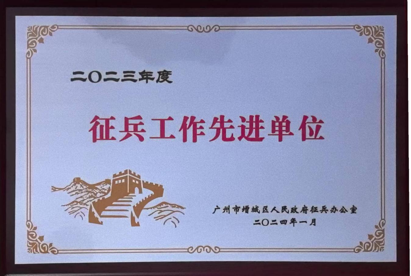 廣州市增城區(qū)人民政府征兵辦公室頒發(fā)的“征兵工作先進單位”牌匾