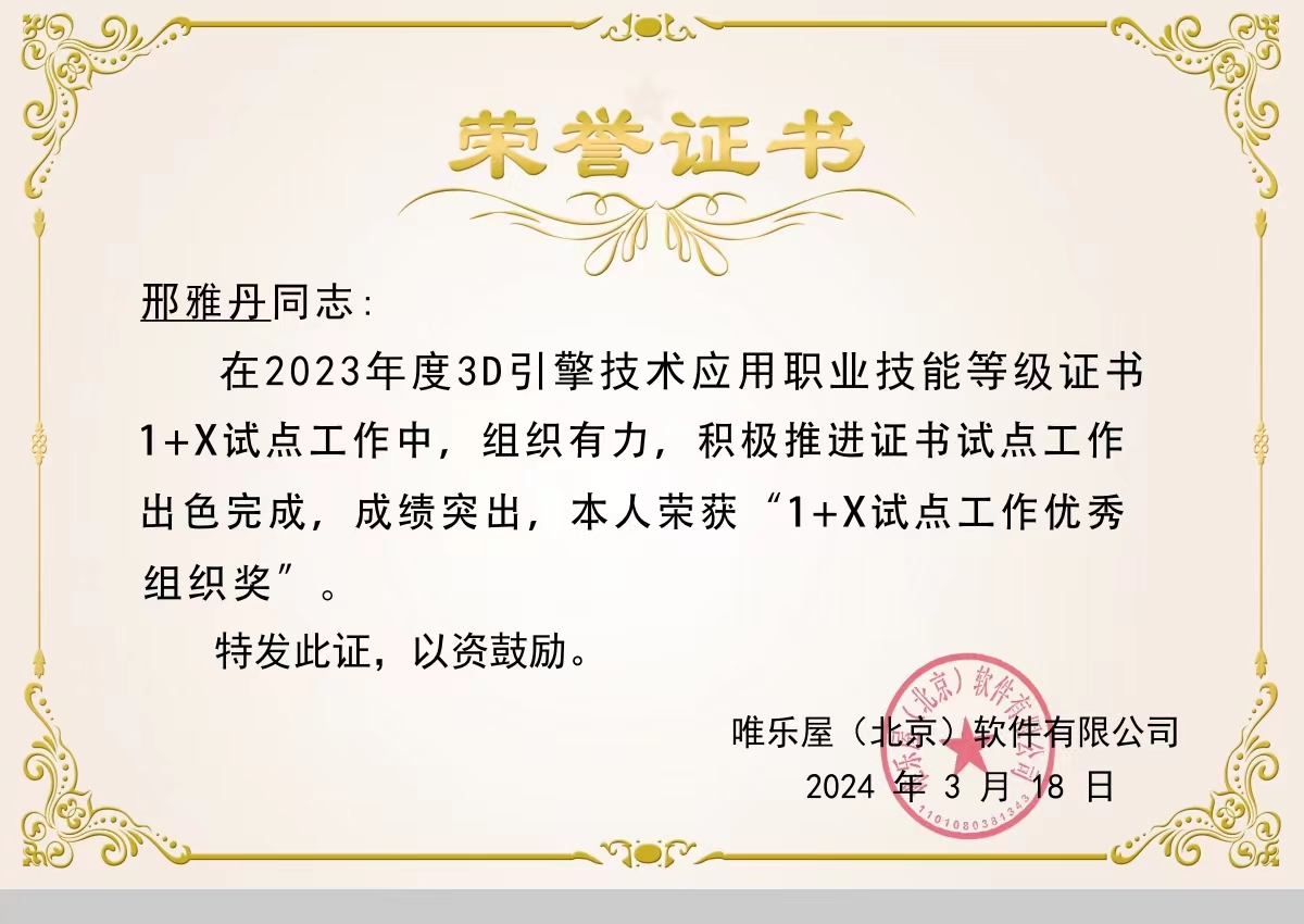 2024年3月18日,藝術(shù)與傳媒學(xué)院在國(guó)家指定1+X職業(yè)院校職業(yè)證書認(rèn)證單位唯樂屋年度表彰大會(huì)上獲得“1+X試點(diǎn)工作優(yōu)秀院校”、“優(yōu)秀組織獎(jiǎng)”、“優(yōu)秀教師”、“優(yōu)秀考評(píng)員”獎(jiǎng)項(xiàng)。