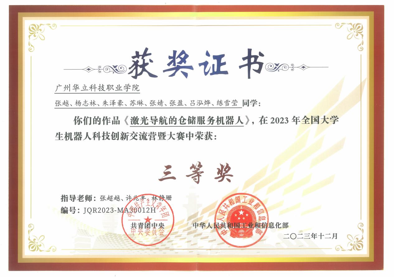 近日,由共青團中央、工業(yè)和信息化部主辦的2023年全國大學(xué)生機器人科技創(chuàng)新交流營暨機器人大賽結(jié)果公布,我校張超越、林靜珊老師指導(dǎo)的《激光導(dǎo)航的倉儲服務(wù)機器人》作品榮獲全國三等獎,這是我校在該項賽事上的歷史最好成績。