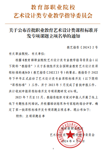 我校教師獲教育部職業(yè)院校藝術(shù)設(shè)計(jì)類(lèi)專(zhuān)業(yè)教學(xué)指導(dǎo)委員會(huì)“首批課程標(biāo)準(zhǔn)開(kāi)發(fā)專(zhuān)項(xiàng)課題”立項(xiàng)2項(xiàng)