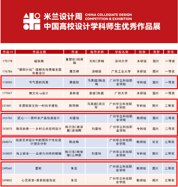 近日,由中國高等教育學(xué)會、中國教育國際交流協(xié)會主辦的“第八屆米蘭設(shè)計周-中國高校設(shè)計學(xué)科師生優(yōu)秀作品展”廣東賽區(qū)評選圓滿落幕。我校藝術(shù)與傳媒學(xué)院師生榮獲一等獎1項,二等獎3項,三等獎4項,(一、二等獎作品晉級國賽)。