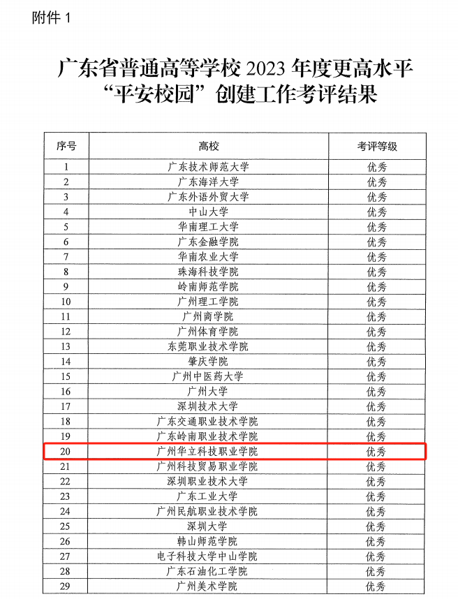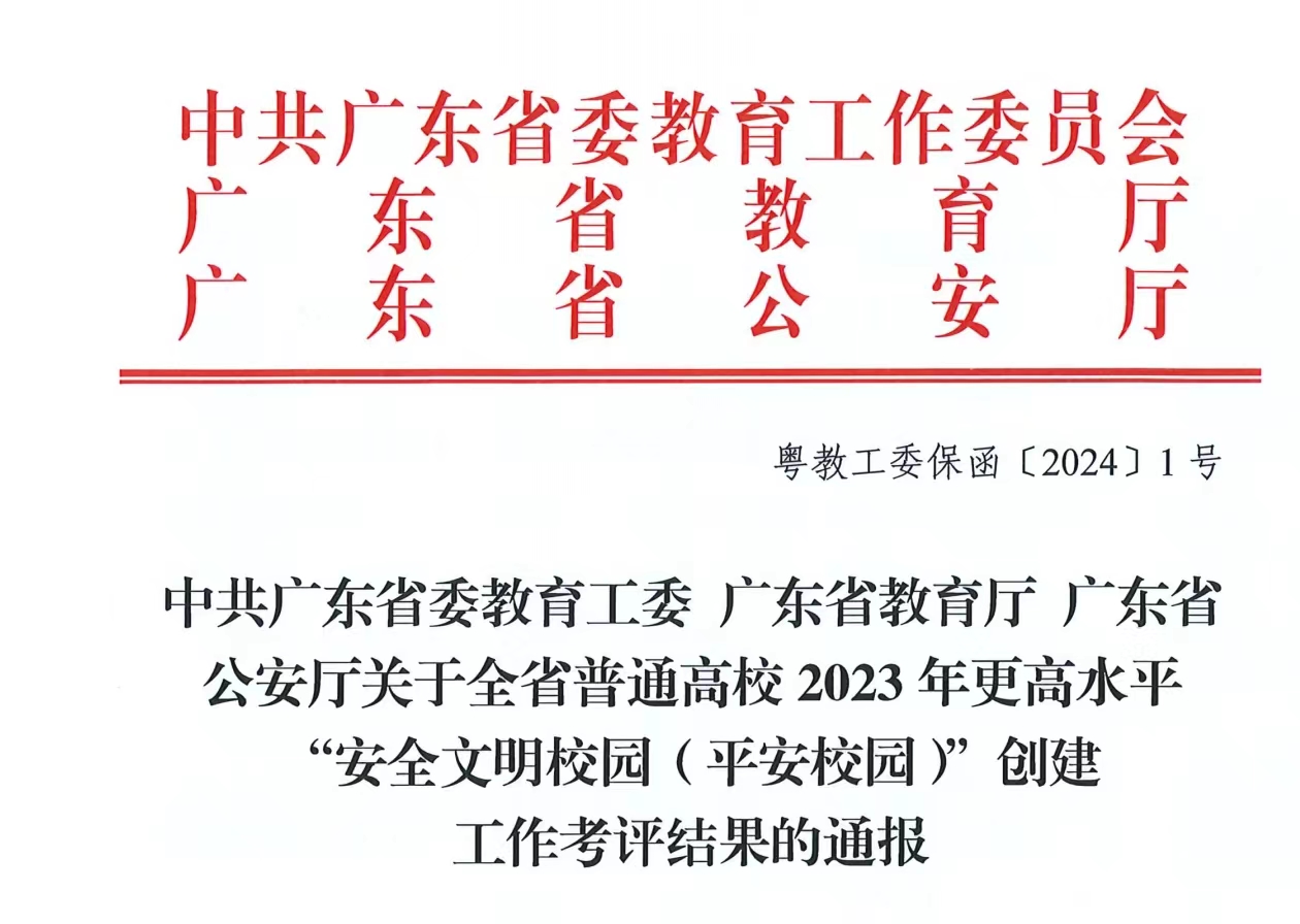 近日,中共廣東省委教育工委、廣東省教育廳、廣東省公安廳聯(lián)合發(fā)布了《關(guān)于全省普通高校2023年更高水平“安全文明校園(平安校園)”創(chuàng)建工作考評結(jié)果的通報》(粵教工委保函〔2024〕1號)文件,我校在全省160所高校中名列前茅,考評結(jié)果為優(yōu)秀,在考評結(jié)果為優(yōu)秀的55所高校中位列20,這是對我校教育事業(yè)發(fā)展和學(xué)校安全工作的重要肯定。