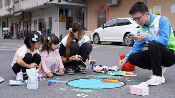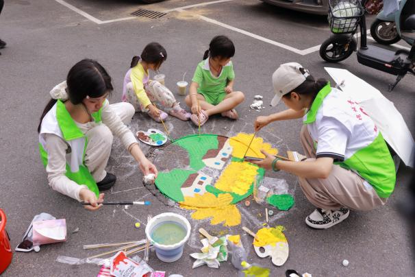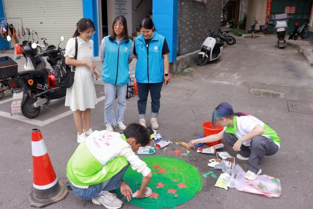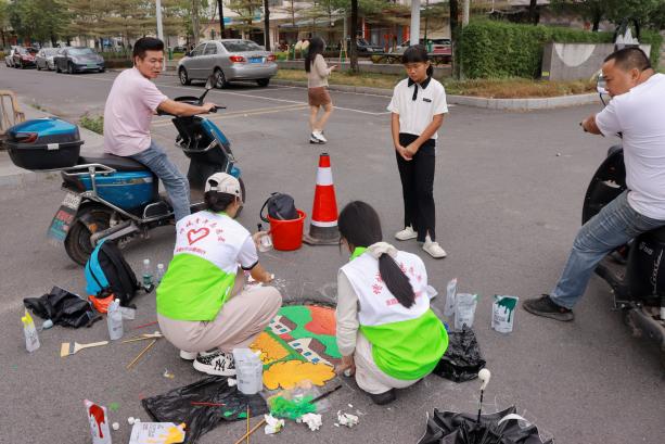 在活動(dòng)現(xiàn)場(chǎng),突擊隊(duì)員們身著統(tǒng)一服裝,精神抖擻。他們充分發(fā)揮自身專業(yè)優(yōu)勢(shì),用畫筆描繪出綠美廣東的壯麗景色,以藝術(shù)的形式傳遞環(huán)保理念。突擊隊(duì)員攜帶專業(yè)繪畫工具和環(huán)保顏料,在社區(qū)工作人員的引導(dǎo)下,以社區(qū)沙井蓋作為創(chuàng)作平臺(tái),圍繞“綠美廣東”“多色社區(qū)”“IP形象”等主題,結(jié)合桃源里社區(qū)特色,精心設(shè)計(jì)了多款圖案,旨在通過藝術(shù)的形式,向社區(qū)居民傳遞多彩生活、美麗社區(qū)的理念,提高大家對(duì)社區(qū)的歸屬感與認(rèn)同感,也為社區(qū)帶來了一抹亮麗的色彩。