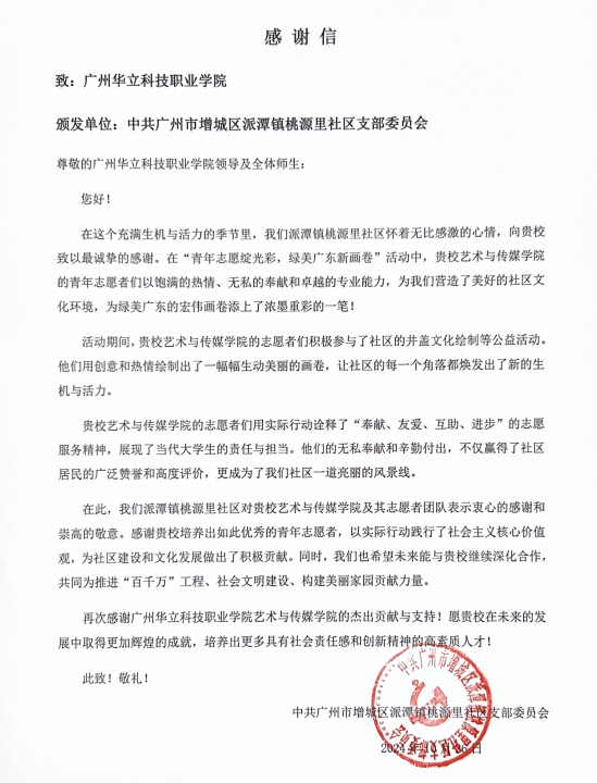此次“青年志愿綻光彩,綠美廣東新畫卷”井蓋藝術(shù)繪制活動(dòng),不僅展現(xiàn)了藝傳學(xué)院青年志愿者的風(fēng)采,也為綠美廣東的建設(shè)增添了生動(dòng)的一筆。通過藝術(shù)的力量,志愿者們將環(huán)保理念深植于居民心中,共同繪制了一幅幅美麗的社區(qū)藝術(shù)畫卷,為構(gòu)建美麗中國(guó)貢獻(xiàn)了自己的青春力量!未來,藝傳學(xué)院將繼續(xù)秉承“服務(wù)社會(huì)、回饋社會(huì)”的宗旨,開展更多形式多樣的志愿服務(wù)活動(dòng),為構(gòu)建和諧美好的社會(huì)環(huán)境貢獻(xiàn)力量。(后附感謝信)
