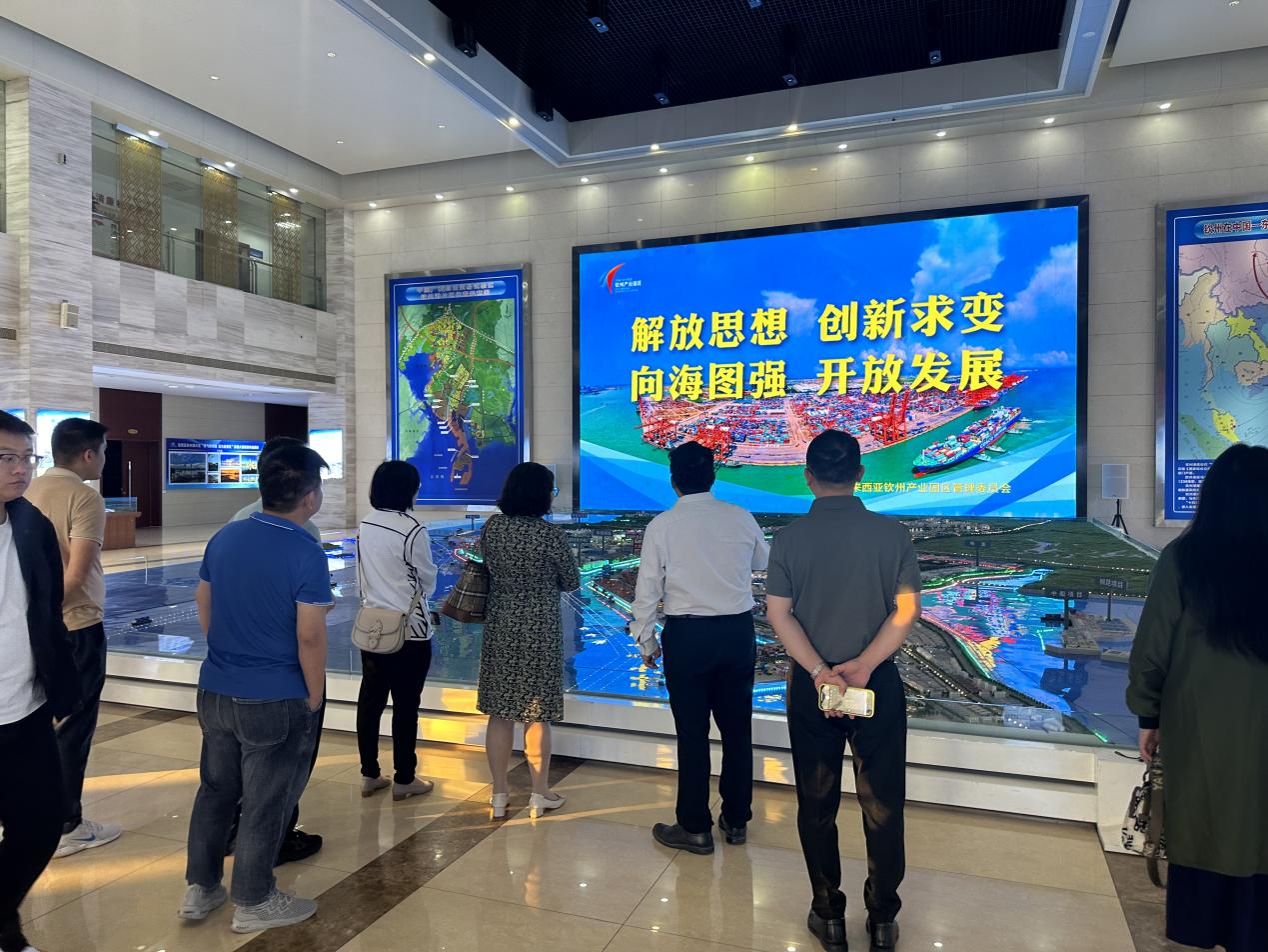 座談環(huán)節(jié)結束后,兩校赴中國(廣西)自由貿易試驗區(qū)欽州港片區(qū)參觀。在講解人員的帶領下,參觀了自貿區(qū)沙盤、觀看了自貿區(qū)介紹視頻,宏觀了解了自貿區(qū)的格局、運營等。