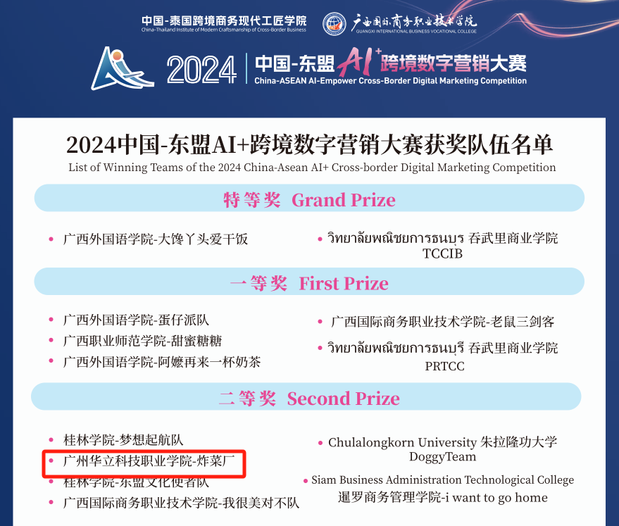 2024年中國(guó)—東盟AI+跨境數(shù)字營(yíng)銷(xiāo)大賽自11月12日在泰國(guó)曼谷啟動(dòng)至12月15日在廣西南寧決賽路演,歷時(shí)一個(gè)多月。此次大賽是我國(guó)首次在AI+跨境數(shù)字營(yíng)銷(xiāo)領(lǐng)域舉辦的世界性賽事,共有來(lái)自中國(guó)、泰國(guó)、馬來(lái)西亞、柬埔寨、越南、菲律賓等國(guó)家的372支隊(duì)伍參賽,展開(kāi)了一場(chǎng)精彩紛呈的技能切磋。經(jīng)過(guò)激烈而緊張的角逐,我校經(jīng)濟(jì)管理學(xué)院教師呂麗靜、余曼指導(dǎo)的吳東恒、陳志紅、李梓威團(tuán)隊(duì)脫穎而出,憑借精湛技能、創(chuàng)新創(chuàng)意和卓越的綜合表現(xiàn)榮獲二等獎(jiǎng),并有9支團(tuán)隊(duì)獲得優(yōu)勝獎(jiǎng),碩果累累。