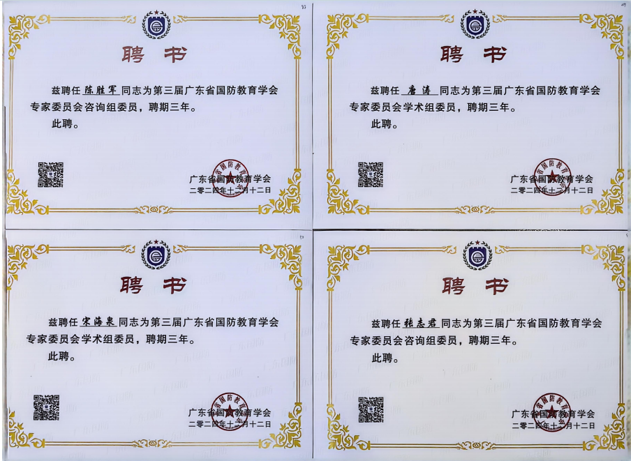 在廣東省國防教育學會組織的2024年度“國防教育先進評選”活動中,經(jīng)過嚴格評審與綜合考量,廣州華立科技職業(yè)學院憑借在國防教育領(lǐng)域內(nèi)的卓越貢獻與顯著成效,榮耀地被授予“國防教育先進單位”稱號。同時,我校陳勝軍、張志君、宋海泉、唐濤四位老師被聘為第三屆廣東省國防教育學會專家委員會成員,陳勝軍、唐濤兩位老師被授予“國防教育先進個人”榮譽稱號。