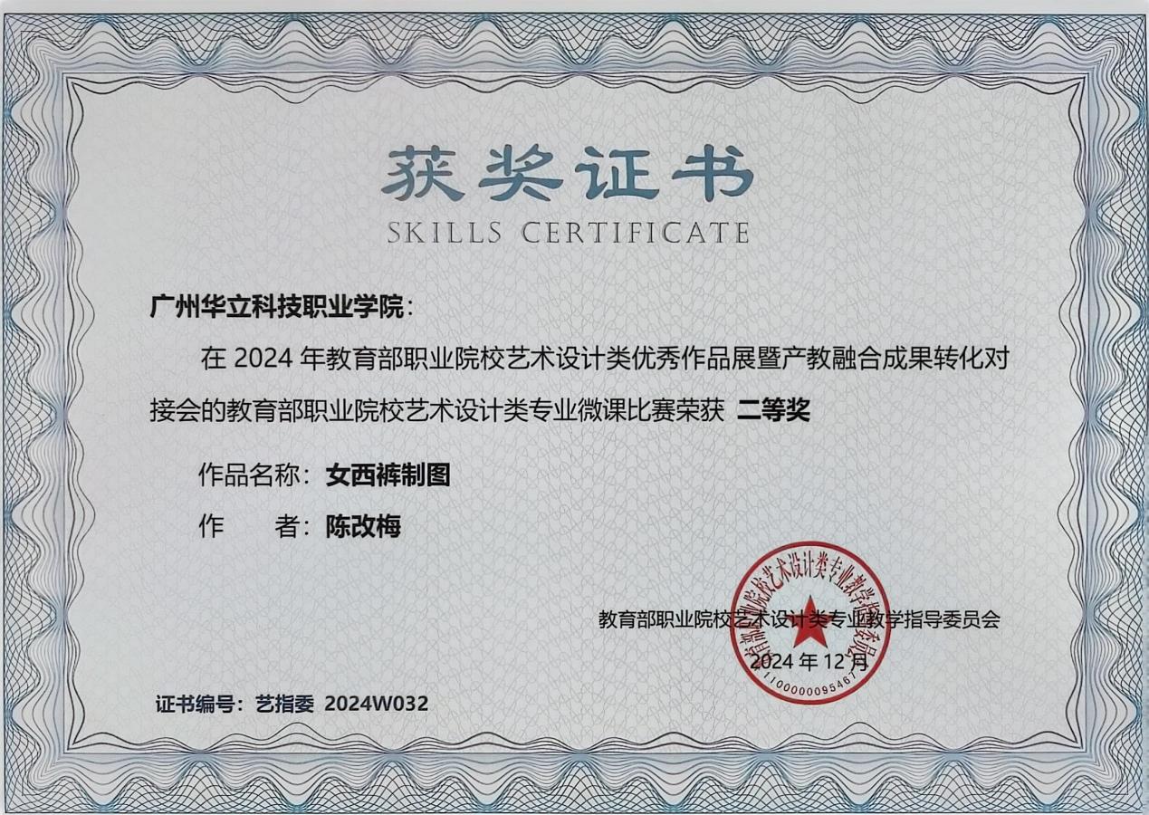 2024年12月13日-15日,由教育部職業(yè)院校藝術(shù)設(shè)計(jì)類專業(yè)教學(xué)指導(dǎo)委員會(huì)主辦的“職業(yè)院校藝術(shù)設(shè)計(jì)類優(yōu)秀作品展暨 2024年產(chǎn)教融合成果轉(zhuǎn)化對(duì)接會(huì)”在廣州琶洲靈感創(chuàng)新展館盛大舉行。在本次對(duì)接會(huì)的教育部職業(yè)院校藝術(shù)設(shè)計(jì)類專業(yè)微課比賽中,廣州華立科技職業(yè)學(xué)院藝術(shù)與傳媒學(xué)院陳改梅老師憑借作品《女西褲制圖》脫穎而出,榮獲國賽二等獎(jiǎng)。