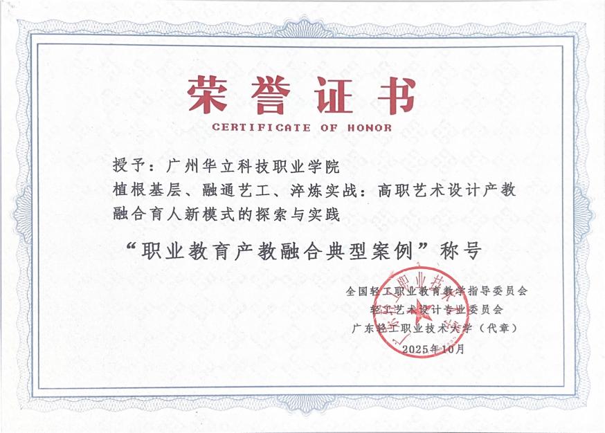 此次研討會(huì)是華立職院在藝術(shù)設(shè)計(jì)教育創(chuàng)新和產(chǎn)教融合方面邁出的重要一步。經(jīng)全國(guó)輕工藝術(shù)設(shè)計(jì)專業(yè)委員會(huì)和共同體專家評(píng)審:由馬俊 、肖釗俊、沈泓睿、王渡讀團(tuán)隊(duì)制作的紀(jì)錄片榮獲中國(guó)大學(xué)生廣告藝術(shù)學(xué)院獎(jiǎng) 2025年“筑夢(mèng)產(chǎn)教·校長(zhǎng)印記”賽項(xiàng)“金獎(jiǎng)”;華立職院產(chǎn)教融合案例“植根基層、融通藝工、淬煉實(shí)戰(zhàn):高職藝術(shù)設(shè)計(jì)產(chǎn)教融合育人新模式的探索與實(shí)踐”榮獲“產(chǎn)教融合典型案例”;華立職院藝術(shù)與傳媒學(xué)院黨總支書記陳改梅、就業(yè)主任黎映如獲聘“全國(guó)輕工藝術(shù)設(shè)計(jì)專委會(huì)智庫(kù)專家”;華立職院“冠岳宅吉美項(xiàng)目班”產(chǎn)教融合案例,正式載入《2025年中國(guó)廣告年鑒》,以彰顯其行業(yè)價(jià)值與引領(lǐng)意義;學(xué)校獲評(píng)創(chuàng)意星大學(xué)生實(shí)踐人才培育工程-廣州華立科技職業(yè)學(xué)院網(wǎng)易傳媒新媒體人才孵化計(jì)劃實(shí)訓(xùn)單位。