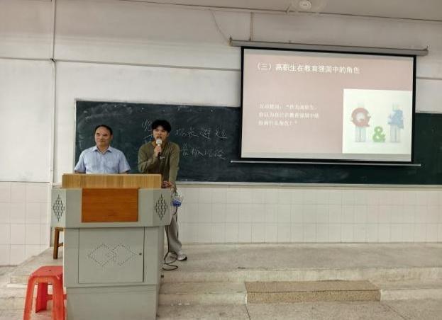廖校長強調,職業(yè)教育是與普通教育同等重要的教育類型,是國民教育體系和人力資源開發(fā)的重要組成部分。高職畢業(yè)生占新增就業(yè)人口70%,制造業(yè)一線技術骨干80%來自高職,職業(yè)教育已成為教育強國的“半壁江山”,職業(yè)教育大有可為。在互動環(huán)節(jié),他提出“作為高職學生,你認為自己在教育強國中能扮演什么角色”等問題,引發(fā)學生深思。他引用習近平總書記的青年寄語:“青年一代有理想、有本領、有擔當,國家就有前途,民族就有希望”,鼓勵學生立大志、明大德、成大才,將個人成長融入國家發(fā)展。