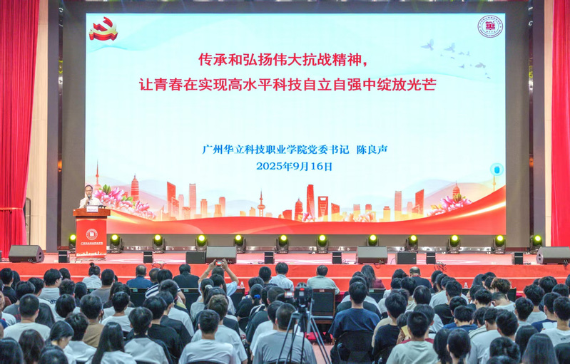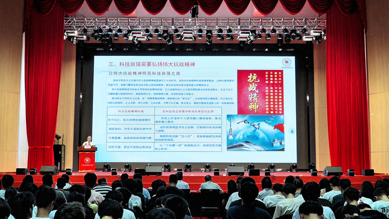 9月16日,廣州華立科技職業(yè)學院云浮校區(qū)文體樓8樓報告廳內(nèi)座無虛席,氣氛莊重而熱烈。學校黨委書記陳良聲同志以“傳承和弘揚偉大抗戰(zhàn)精神,讓青春在實現(xiàn)高水平科技自立自強中綻放光芒”為題,圍繞“關于科技創(chuàng)新的重要論述、我國科技創(chuàng)新的當代成就、科技自強需弘揚抗戰(zhàn)精神、在科技自立中譜寫新華章”四個方面內(nèi)容,為2025級新生代表講授了一堂深刻而精彩的秋季學期“思政第一課”。這堂思政課不僅是一次思想的洗禮,更是一次奮進的動員,深刻闡述了偉大抗戰(zhàn)精神的時代價值,并將其與當代青年學子的歷史使命、與國家實現(xiàn)高水平科技自立自強緊密相連。
