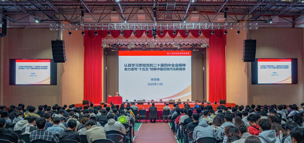 為深入學(xué)習(xí)貫徹黨的二十屆四中全會精神,引導(dǎo)廣大師生準(zhǔn)確把握“十五五”時期國家發(fā)展戰(zhàn)略與計算機(jī)學(xué)科的使命關(guān)聯(lián),2025年11月18日下午,學(xué)校副校長陳顯強(qiáng)教授在云浮校區(qū)文體樓8樓為計算機(jī)信息工程學(xué)院400余名師生代表帶來一場題為《認(rèn)真學(xué)習(xí)貫徹黨的二十屆四中全會精神,奮力譜寫“十五五”時期中國式現(xiàn)代化新篇章》的“思政第一課”。