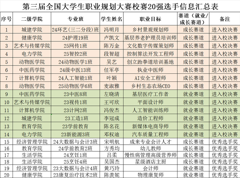 自2025年10月活動(dòng)開展至今,根據(jù)教育部職規(guī)賽管理平臺(tái)報(bào)名數(shù)據(jù)顯示,我校共計(jì)報(bào)名人數(shù)為21173人,其中成長賽道15991人,就業(yè)賽道5182人,報(bào)名率接近90%。各二級(jí)學(xué)院優(yōu)秀學(xué)生作品經(jīng)過各院賽挑選和學(xué)校校賽初賽評選,最終24環(huán)藝(三二分段)班馮明月等20名同學(xué)優(yōu)秀作品進(jìn)入校賽20強(qiáng),同時(shí)成長賽道前8名和就業(yè)賽道前6名同學(xué)將參加12月4日學(xué)校校賽現(xiàn)場PK賽一、二、三等獎(jiǎng)的角逐。現(xiàn)將第三屆全國大學(xué)生職業(yè)規(guī)劃大賽廣州華立科技職業(yè)學(xué)院校賽20強(qiáng)選手名單及進(jìn)入校決賽的14強(qiáng)選手名單公示如下,公示時(shí)長5個(gè)工作日。公示期內(nèi)如有異議可與學(xué)校校賽組委會(huì)(就業(yè)指導(dǎo)中心)反饋真實(shí)情況。