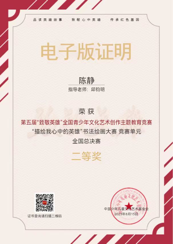近日,在第五屆“致敬英雄”全國青少年文化藝術(shù)創(chuàng)作主題教育競賽“描繪我心中的英雄”書法繪畫大賽中,由教育學(xué)院邱鈞明老師精心指導(dǎo)的學(xué)前教育專業(yè)21級(jí)學(xué)生陳靜創(chuàng)作的作品獲全國總決賽二等獎(jiǎng)。