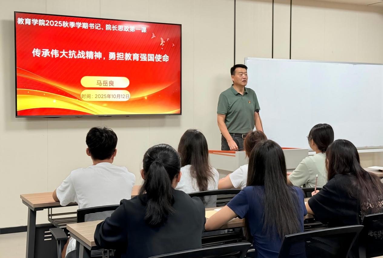 為引導(dǎo)新生厚植家國情懷、明確時(shí)代使命,10月12日晚,教育學(xué)院黨總支書記、院長馬岳良教授,以“傳承偉大抗戰(zhàn)精神,勇?lián)逃龔?qiáng)國使命”為主題,從“銘記歷史、錘煉作風(fēng)、明確使命”三個(gè)方面,為2025級學(xué)前教育、體育教育、美術(shù)教育專業(yè)新生們帶來了一堂兼具思想深度與實(shí)踐指導(dǎo)意義的思政第一課。