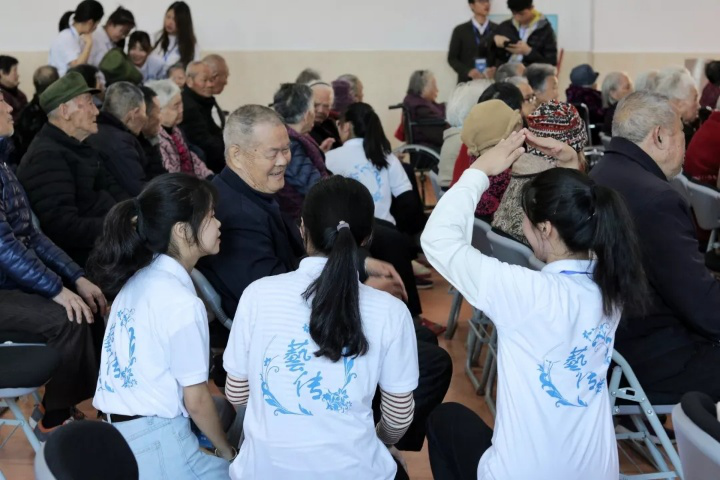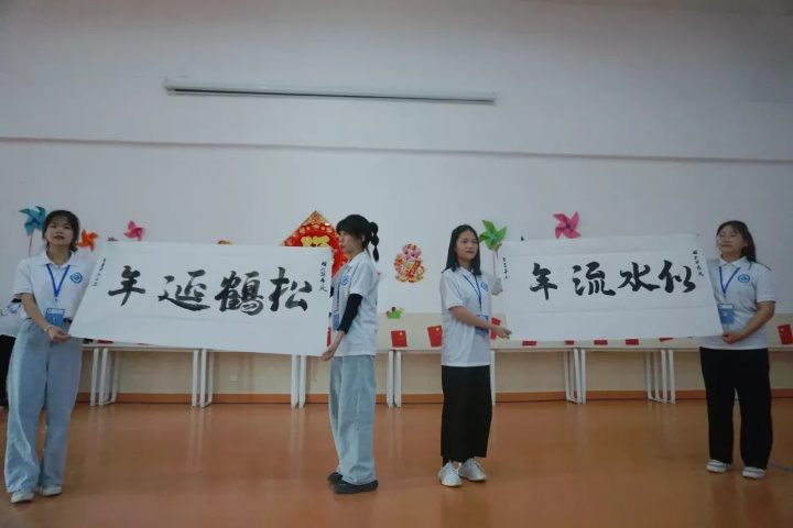 到達(dá)敬老院后由實(shí)踐部干部帶領(lǐng)學(xué)生會干事排隊(duì)進(jìn)入敬老院活動室,干事們陪老人們聊天逗樂,為老人們帶來了舞蹈《美美噠》、歌曲《外婆的澎湖灣》《那些年你很冒險(xiǎn)的夢》、手語操《國家》,以及學(xué)生會外聯(lián)部部長為老人們送上書法“松鶴延年,似水流年”的祝福,最后所有干事以一首《千山萬水》結(jié)束了此次敬老院文藝匯演。