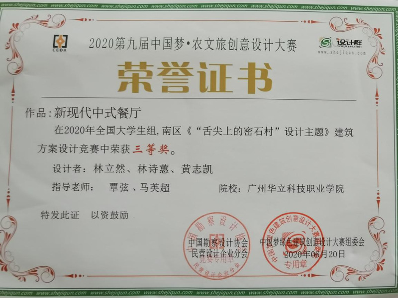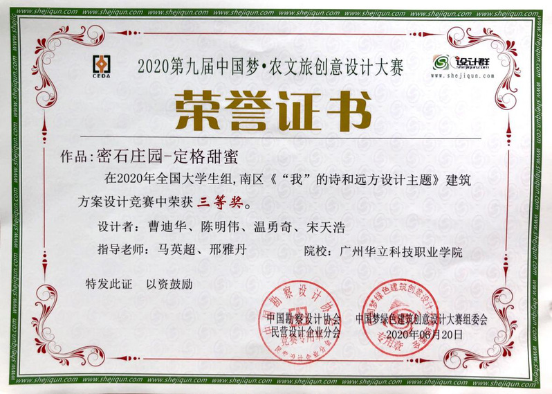 在學院邢雅丹、鄭志強老師帶領(lǐng)下,學院馬英超、覃弦老師積極帶隊參加南區(qū)賽事“都市生活平衡器”獅頭嶺果園設(shè)施改造設(shè)計。通過專家提名、點評及評優(yōu)等多階段選拔,經(jīng)過大家不懈的努力和激烈的競爭,我院學生曹迪華、溫勇奇、宋天浩、陳明偉在“我的詩和遠方”主題設(shè)計中,作品《密石莊園-定格甜蜜》榮獲三等獎;林立然、黃志凱、林詩惠組在“舌尖上的密石村”主題設(shè)計中,作品《新現(xiàn)代中式餐廳》榮獲三等獎。