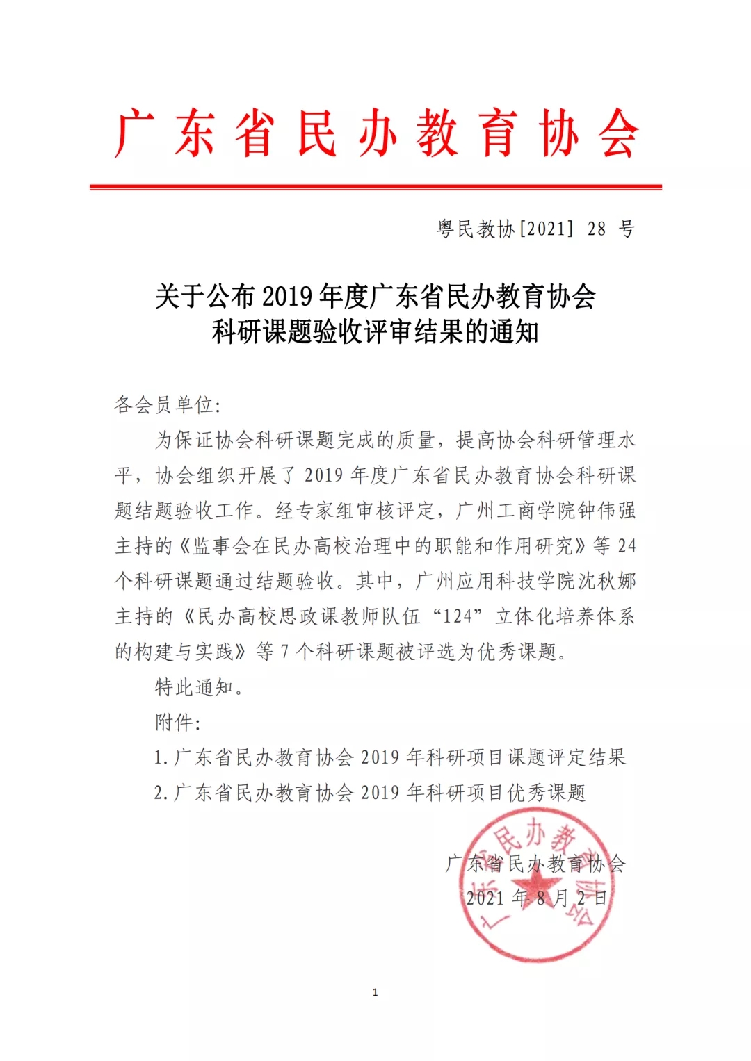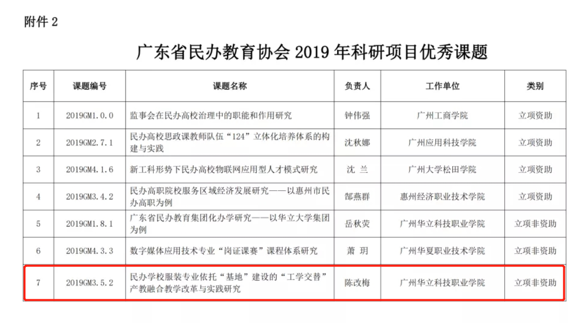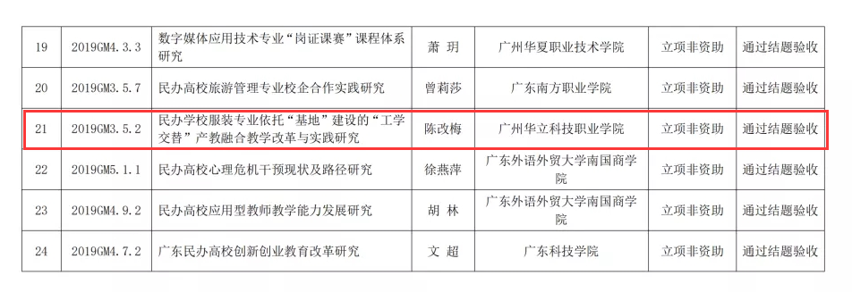 根據(jù)《廣東省民辦教育協(xié)會(huì)關(guān)于開(kāi)展2019年度科研項(xiàng)目結(jié)題驗(yàn)收工作的通知》(粵民教協(xié)〔2019〕6號(hào)),廣東省民辦教育協(xié)會(huì)組織專(zhuān)家開(kāi)展了結(jié)題驗(yàn)收工作,經(jīng)專(zhuān)家組審核評(píng)定,我院陳改梅老師的課題《民辦學(xué)校服裝專(zhuān)業(yè)依托“基地”建設(shè)的“工學(xué)交替”產(chǎn)教融合教學(xué)改革與實(shí)踐研究》(課題編號(hào):2019GM3.5.2)順利通過(guò)驗(yàn)收,課題被評(píng)選為廣東省民辦教育協(xié)會(huì)省級(jí)優(yōu)秀課題。
